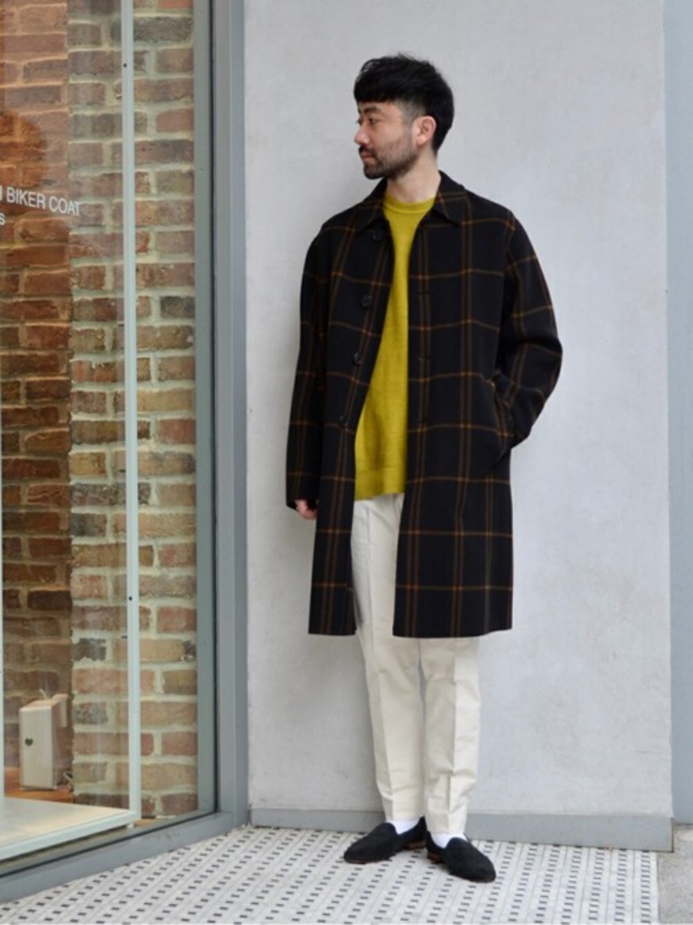 EDIFICE OFFICIAL(PULP 417 EDIFICE)のステンカラーコート「Super120’s モッサ チェック ウール ステンカラーコート」を使ったコーディネート