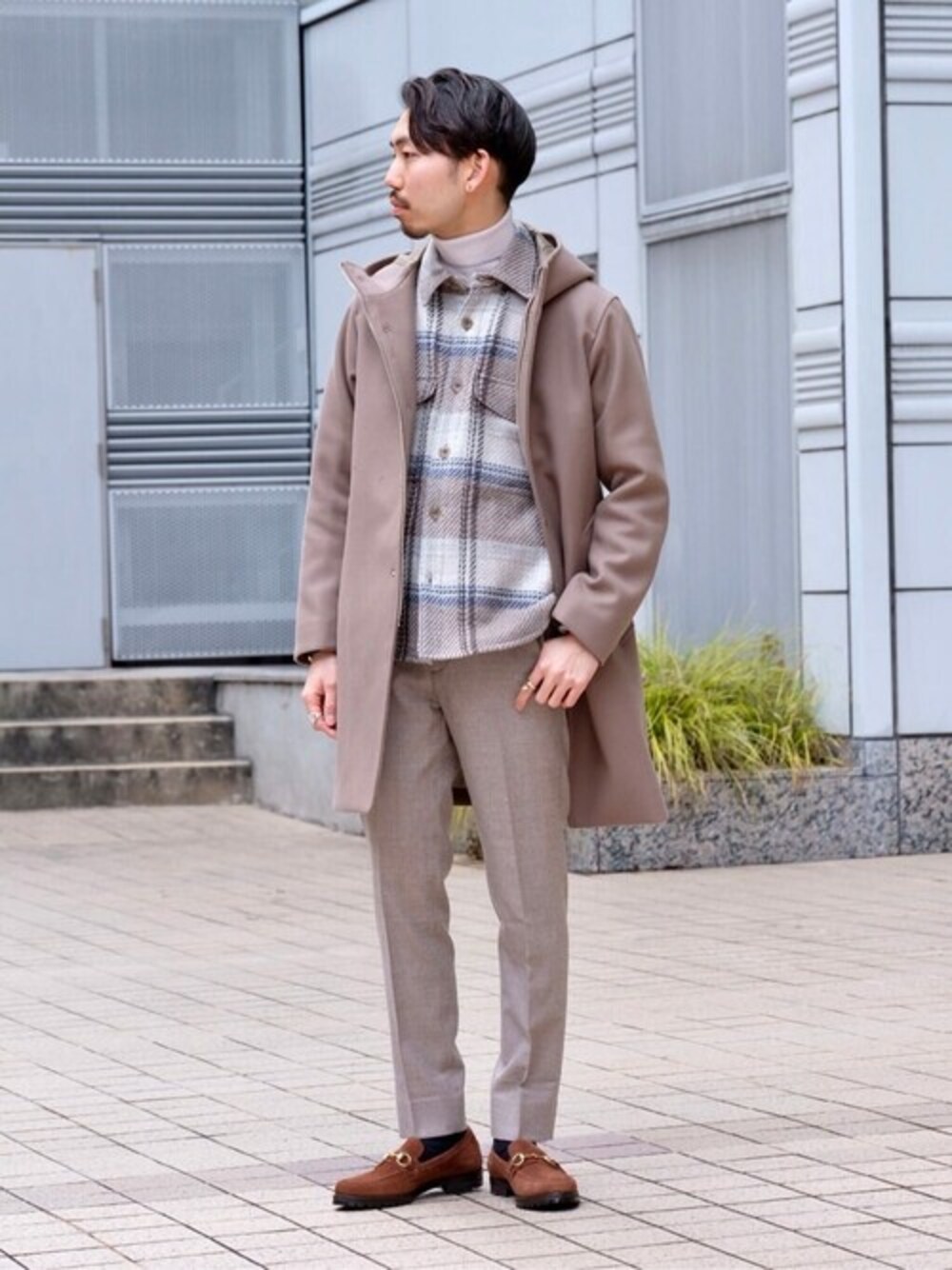 メルトンフードロングコート 《丁度いい綺麗目カジュアルなロングコート》 ○コーディネートポイント○ 定番のアイテムをグレージュのワントーンで全体を揃える事で新鮮な雰囲気にしました。ぼやっとした印象にならないように柄シャツを取り入れメリハリを出しました。 20代後半/身長:172cm/普段サイズ:S/着用サイズ:/S体型:痩せ型 サイズ感:スッキリとしたサイズ感 素材感:メルトン生地なのでお手入れも楽でラフに着れます。 着心地:キメの細かいウールを使っているので、通常のメルトンより柔らかく着やすいです。