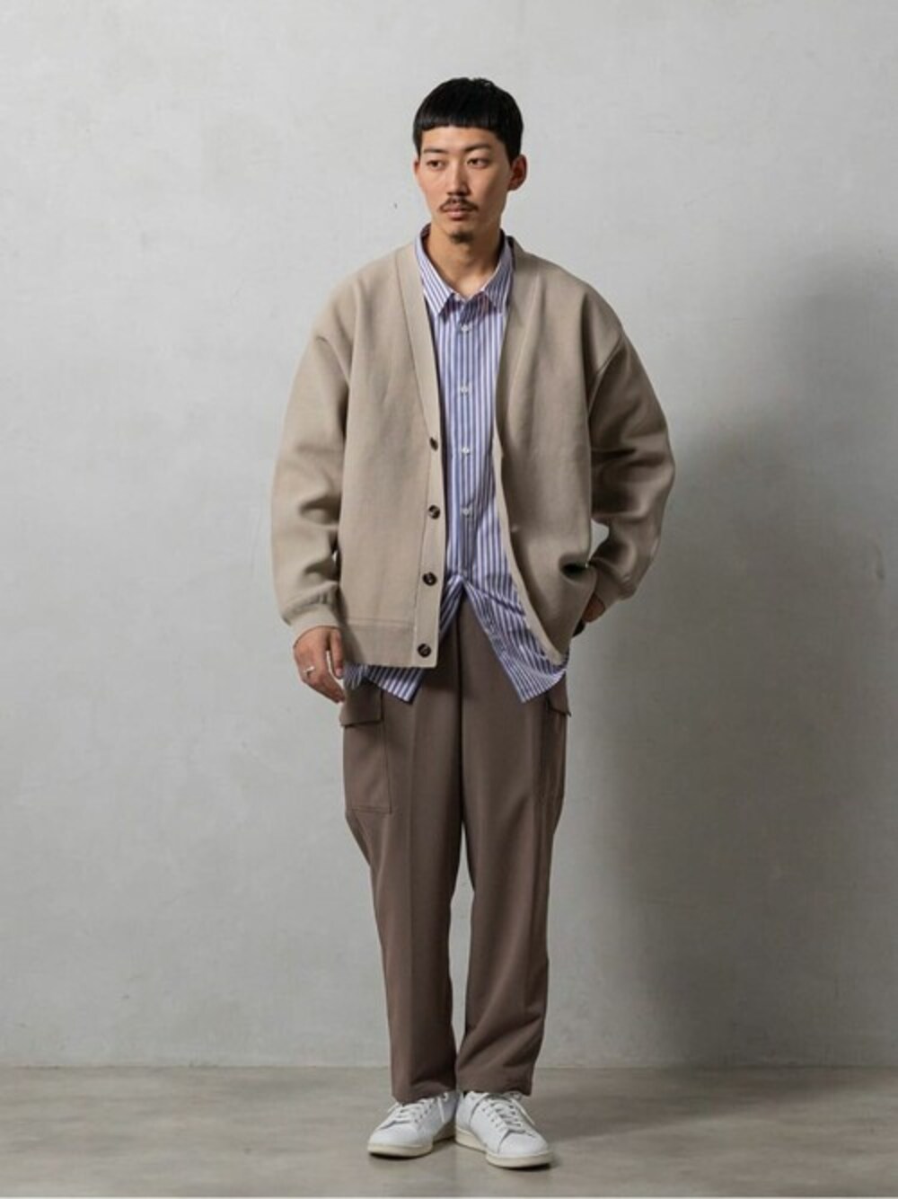 [ポリエステル カーディガン] ゆったりしたカーディガンをシャツとレイヤード。 インナーのシャツが春らしくてポイントです。 身長:177センチ / 体型:標準 / 普段のサイズ :L /着用サイズ : L サイズ感 : ゆったりしたサイズ感 素材感: ポリエステルの軽い生地 着心地 : 柔らかく軽いのでとても着やすい