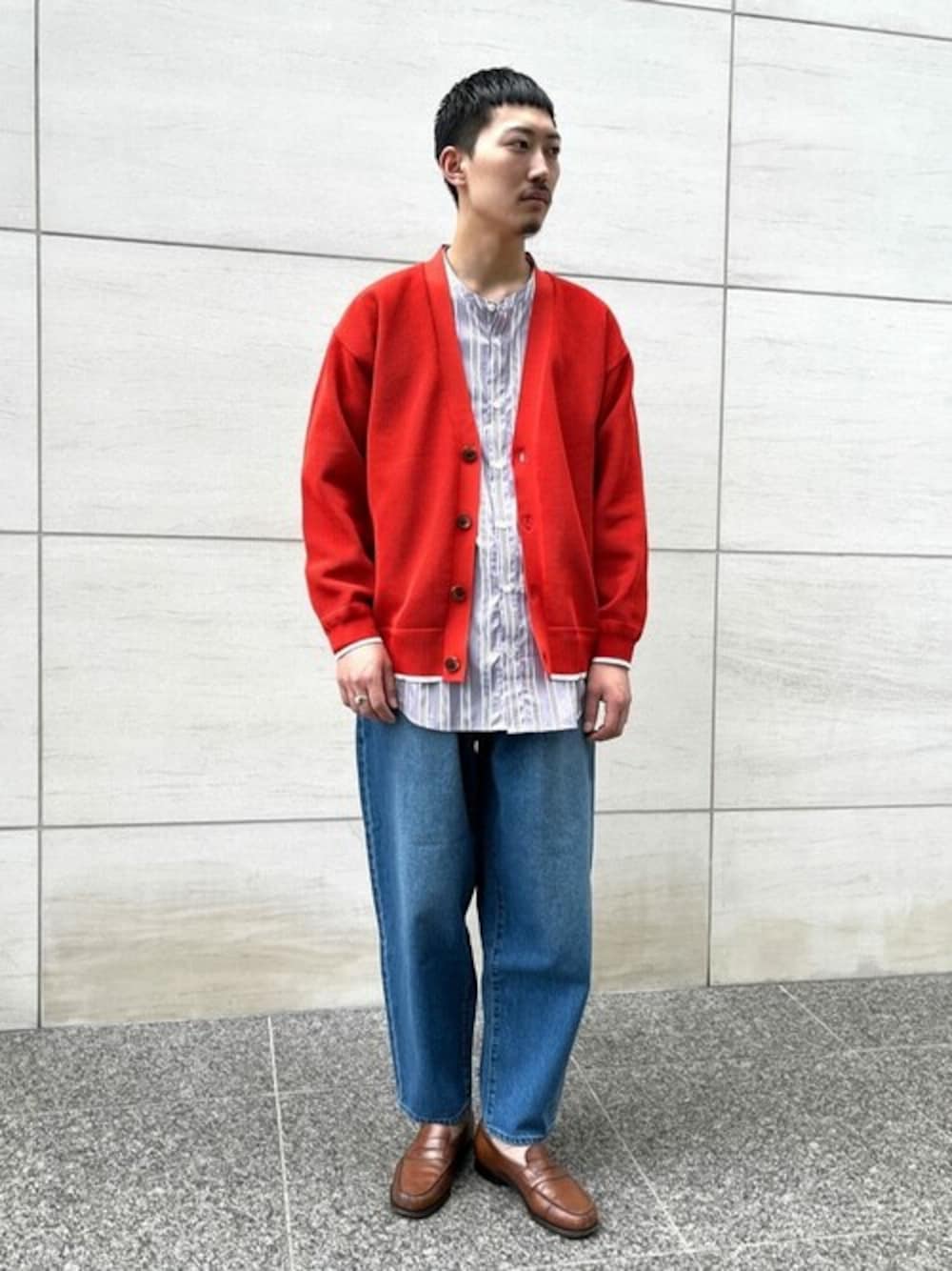 [スポンディッシュ ニット カーディガン] 太めのデニムでスタイリング。 バンドカラーシャツがポイントです。 身長:177センチ / 体型:標準 / 普段のサイズ :L /着用サイズ : M サイズ感 : ゆったりしたサイズ感 素材感: やわらかいポリエステル 着心地 : 柔らかいので着心地が良い