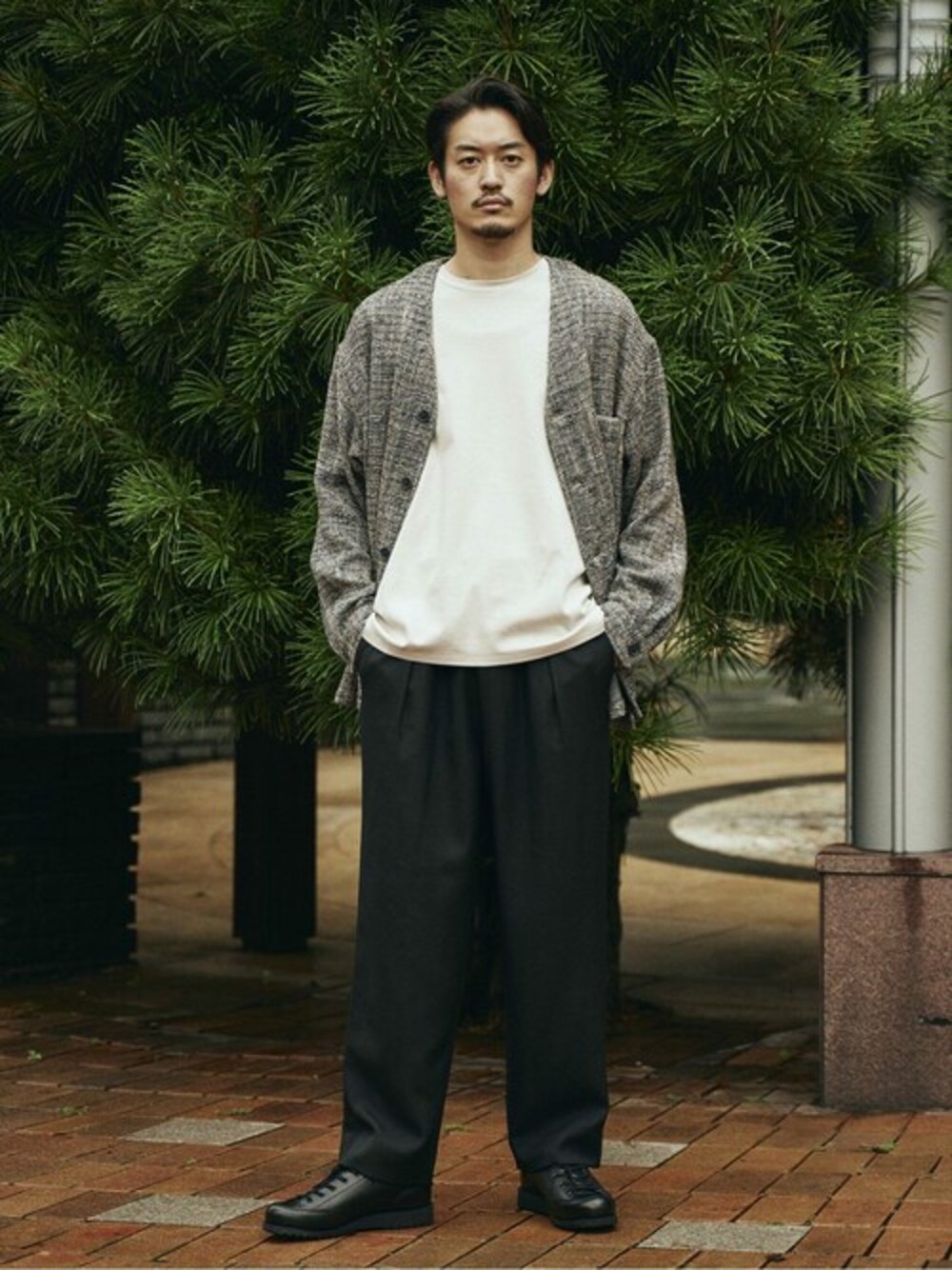 【LA BOUCLE / ラブークル】1タック イージーパンツ(シャークツイード) 身長177cm 体重65kg 普段サイズ:L 着用サイズ:2(M相当) サイズ感:サイズ2でジャストサイズです。 素材感:シャリ感のある表面でさらりとした肌当たり。 着心地:リラックスしたシルエットで心地よい履き心地です。 一言コメント:スラックスのようなキレイな印象のあるイージーパンツ。ラフに羽織れるツイードライクなカーディガンにTシャツを合わせてカジュアルに着こなしました。