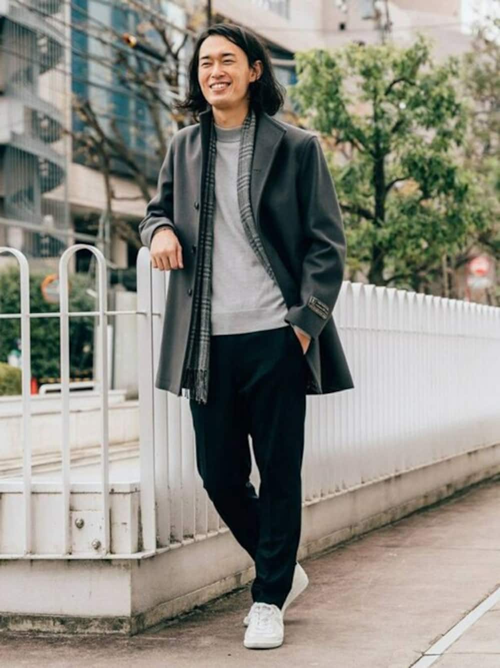 SUPER 150’s ウール メルトン スタンドカラーコート 30代前半 / 身長:178cm / 体型:やせ型 / 普段サイズ:L / 着用サイズ:M コーディネートポイント:同系色で組み合わせた品のあるグレイッシュなコーディネート。グレー系の配色は落ち着いた印象と適度なカジュアル感の両方を得ることができるおすすめのカラーです。 サイズ感:自身の体型でMサイズがちょうどいいサイズバランス。 着心地:かたくて重たいイメージのあるメルトンですが、こちらの商品は真逆で柔らかく軽い印象です。