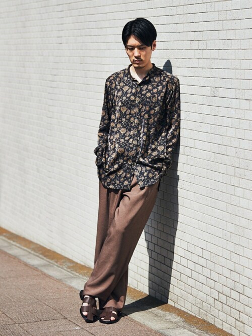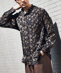 【LA BOUCLE / ラブークル】スタンドカラーシャツ パターン 30代前半/身長:171cm/体型:やせ型/普段サイズ:M/着用サイズ:2(Mサイズ相当) コーディネートポイント:目を惹くボタニカルプリントに合わせ、ブラウンを基調としたカラーパレットでシックにまとめました。 サイズ感:自身の体型で2がちょうどいいサイズです。 着心地:テロっとした独特な落ち感があり、肌触りも非常に気持ちいい素材なので素肌に着用するのもおすすめです。