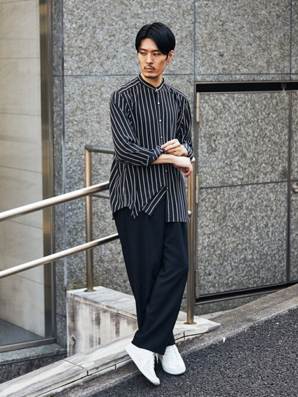 【LA BOUCLE / ラブークル】スタンドカラーシャツ パターン 30代前半/身長:171cm/体型:やせ型/普段サイズ:M/着用サイズ:2(Mサイズ相当) コーディネートポイント:トラッドなストライプシャツを黒でシャープにコーディネート。重たく見えないようにチョイスした足元の白スニーカーがポイントです。 サイズ感:自身の体型で2がちょうどいいサイズです。 着心地:テロっとした独特な落ち感があり、肌触りも非常に気持ちいい素材なので素肌に着用するのもおすすめです。