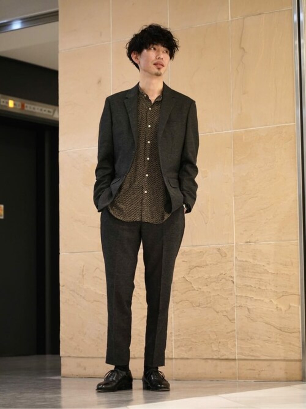 カラミ ストレッチ 2ボタン ジャケット【セットアップ着用可】 ・コーディネートポイント →人気のセットアップをモードに着こなしました。インナーのシャツで柄を足してアクセントにしています。 ・サイズ感 →他品番のEDIFICEのジャケットと変わらず、Lサイズでちょうど良く着用できます。パンツはMサイズですが、こちらは他のパンツに比べて股下が短めに設定されています。 ・着心地 →伸びるメッシュ素材で非常に楽に着用できます。通気性も抜群で真夏でも快適に過ごせそうな素材です。 20代後半/身長:175㎝/体型:標準/普段サイズ:L/着用サイズ:ジャケットL/パンツM