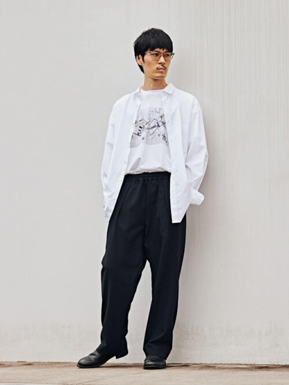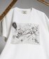 【BAUHAUS / バウハウス】別注 グラフィック プリント Tシャツ 30代前半/身長:171cm/体型:やせ型/普段サイズ:M/着用サイズ:L コーディネートポイント:シックなフォトプリントを引き立てるモノトーンスタイル。ボトムスはスラックスをチョイスし、Tシャツをタックインすることでより品の良い印象に。大人のプリントTシャツの着こなしとしておススメの組み合わせです。 サイズ感:自身の体型でLサイズを着用すると少し肩は落ちますがそこまで大きすぎないサイジングです。ヨーロッパのTシャツに見られるような縦長のシルエットバランスも特徴的。 着心地:洗いのかかったコットンで肌馴染みの良い印象です。
