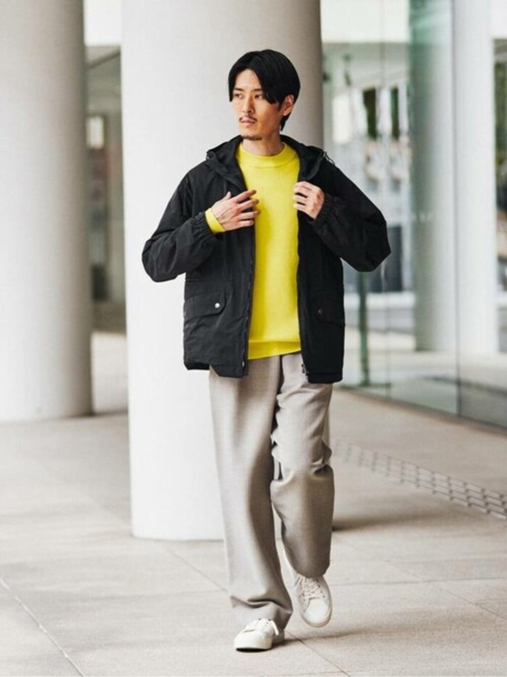 【LIMONTA EAST / リモンタ イースト】フーデッド ミリタリーブルゾン 30代前半/身長:171cm/体型:やせ型/普段サイズ:M/着用サイズ:L コーディネートポイント:ブラックで統一したシックなスポーツMIXスタイル。重たくなりすぎないようにインナーに挿したイエローと足元の白のスニーカーが全体を軽くしてくれます。 サイズ感:自身の体型でLを着用し程よくゆとりのあるサイジング。地厚なものも着こめる身幅の余裕があります。 着心地:ハリコシのある素材ですが、余裕のあるサイズの為楽な着心地です。