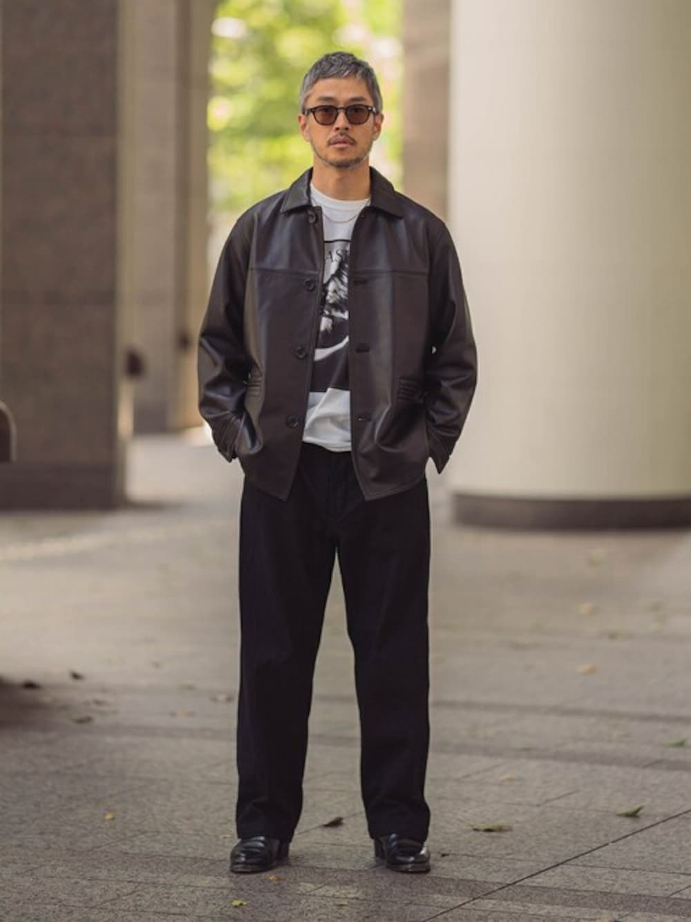 【Levi’s/リーバイス】別注501(R) ORIGINAL DARK INDIGO L28 40代前半 / 身長:172cm / 体型:標準型 / 普段サイズ:M / 着用サイズ:L コーディネートポイント:レザーをベースにしたブラックベースのコーディネート。重くなりすぎない様に、インナーにプリントTを入れて抜け感を出し、サンブラス・アクセサリーでさりげなくスタイルを格上げしています。 サイズ感:適度にゆったりとしたサイズ感 素材感:しっとりとした高級感のあるレザーを使用 着心地:初めから柔らかく馴染みの良い着用感