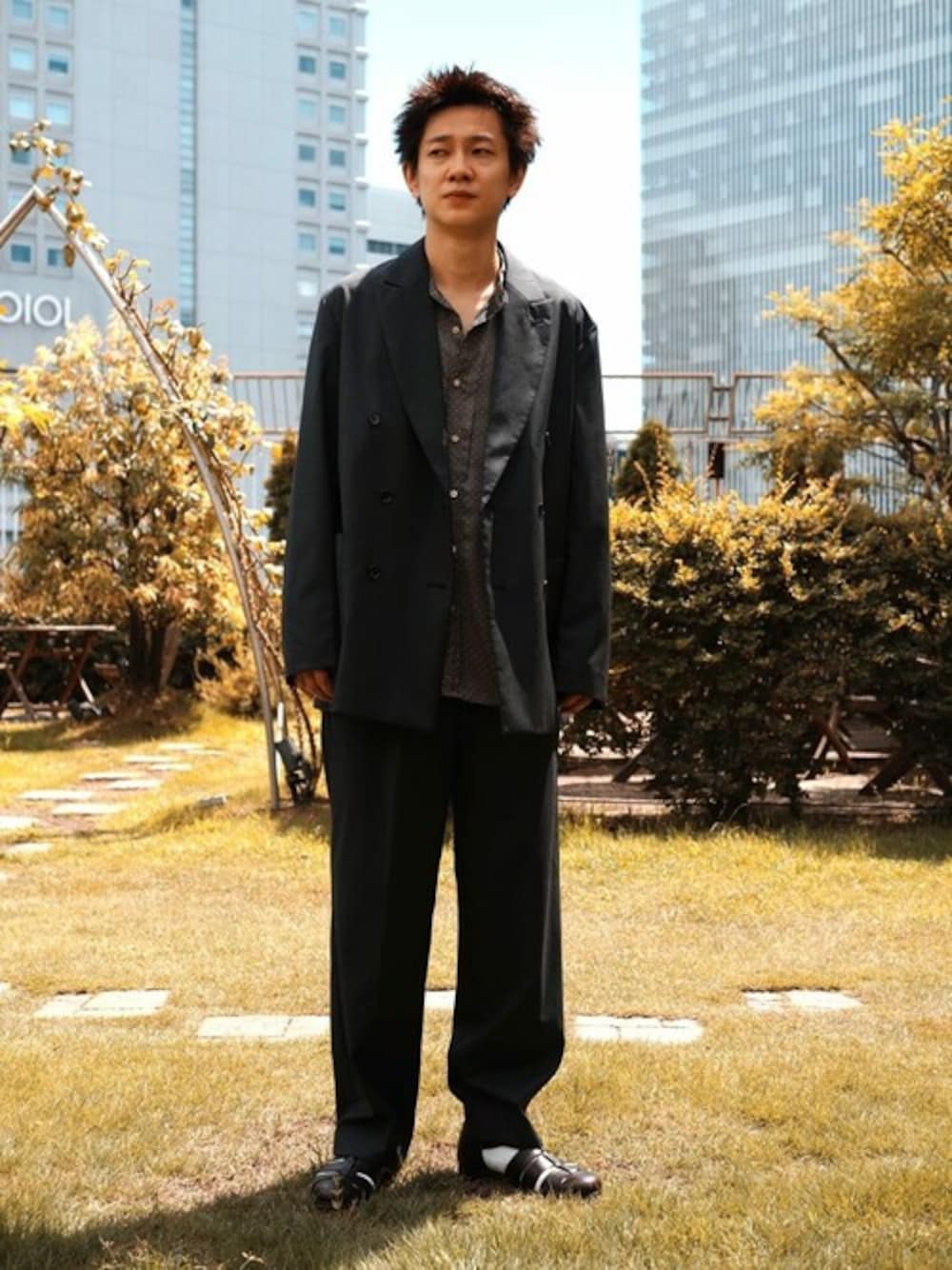 【Loro Piana Fabric】ダブルブレスト ジャケット 圧倒的な高級感を備えながらも肩ひじ張らずに着用することを想定した緩やかなフィッティングは他のジャケットとは一線を画す新鮮なバランスに仕上がっています。 身長:173センチ 体型:細身/ 普段サイズ:M着用サイズ M