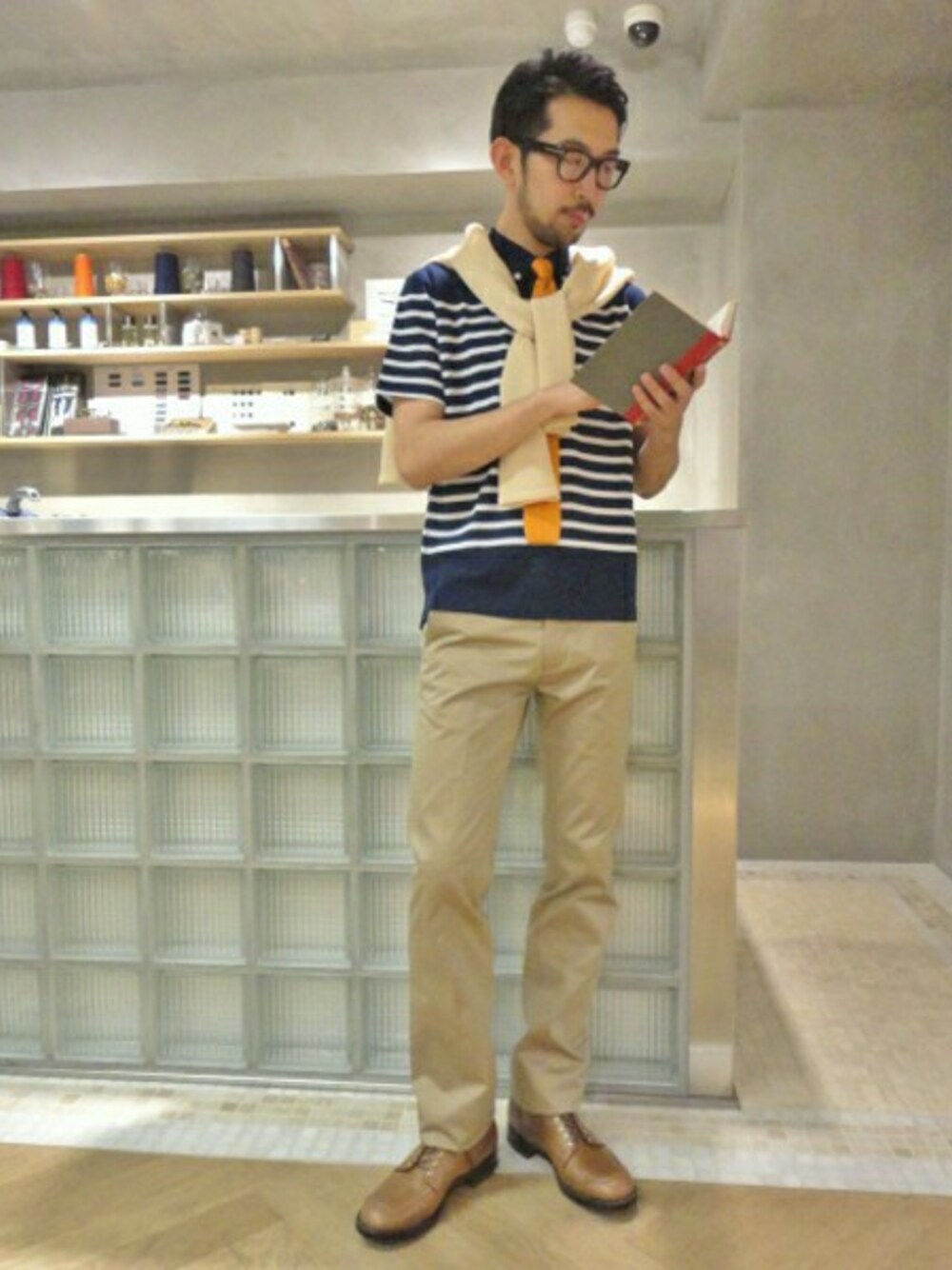 マリンボーダーのポロシャツをプレップなスタイリングにコーディネート。