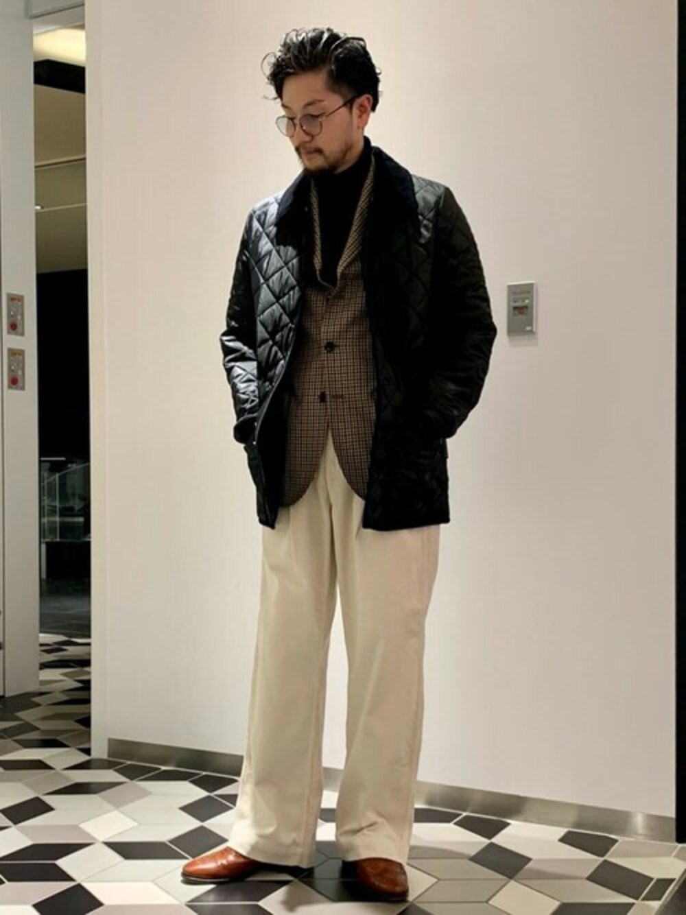 30代前半 / 身長:170cm / 体型:標準体型 / 普段サイズ:M キルティングをクラシックになり過ぎないよう、太めのパンツを合わせてコーディネート。 ◼️ 【MACKINTOSH / マッキントッシュ】別注 WAVERLY ナイロン 着用サイズ:36 ---------------------------------------------------------- サイズ感:ジャストサイズ。身幅はゆとりあり。 素材感 :張りのあるキルティング生地。 着心地 :軽く着やすい。 ----------------------------------------------------------