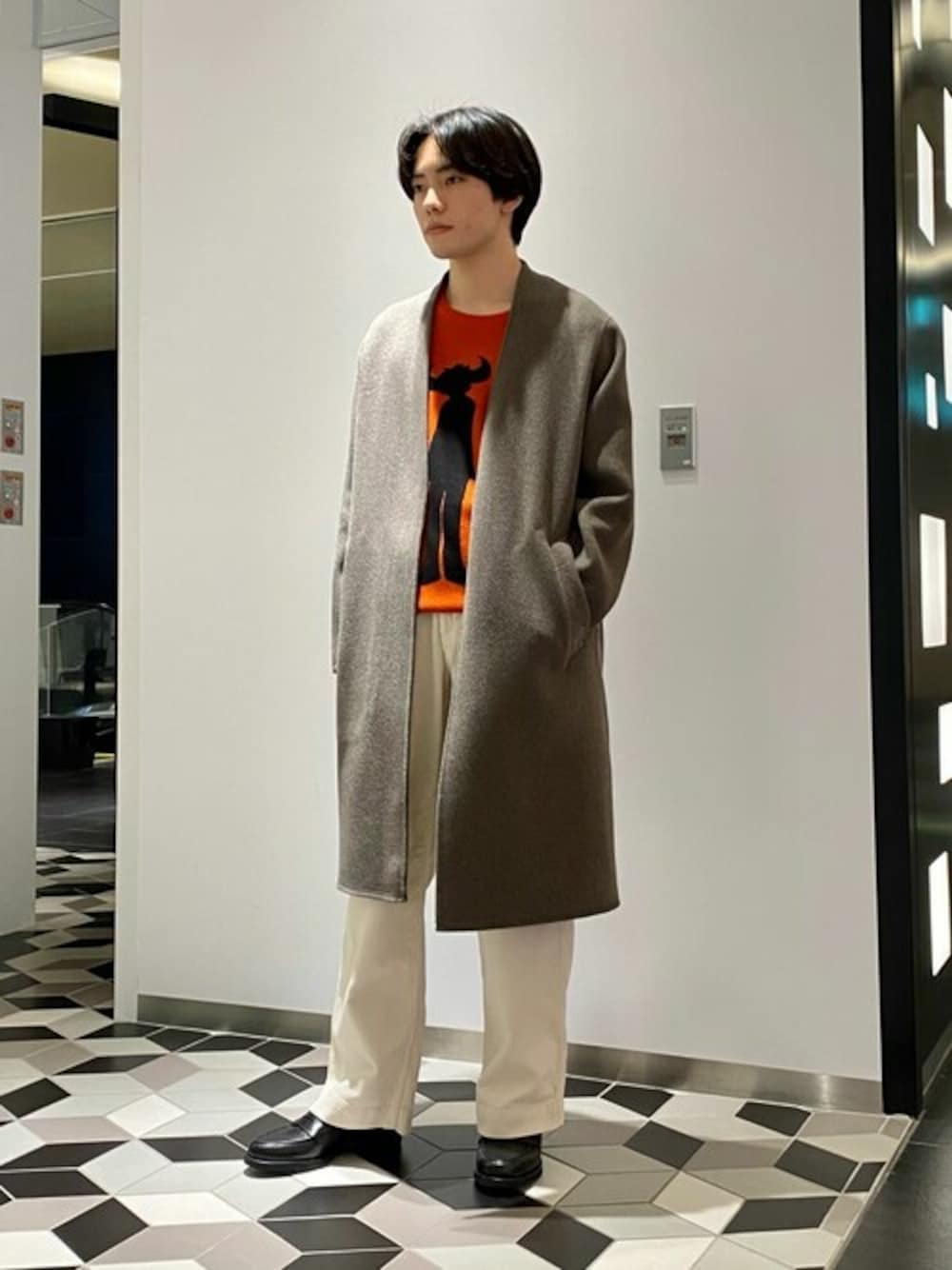 ブランケットリバー ノーカラーガウンコート 20代前半/身長:170センチ、痩せ型/普段サイズ:M/着用サイズ:M 暖かみのある色で統一して秋らしいスタイルにしました。 全体的に淡くなりすぎないようジャミロクワイのニットで少しアクセントをつけてみました。 ----------------------- サイズ感:ゆとりのあるサイズ感なのでインナーに着込んで頂けます。 素材感:肌触りよくサラッとし生地感で、程よい起毛感が暖かさを出してくれます。 着心地:軽量でゆとりのあるサイズ感なので羽織として幅広くお使い頂けます。 -----------------------