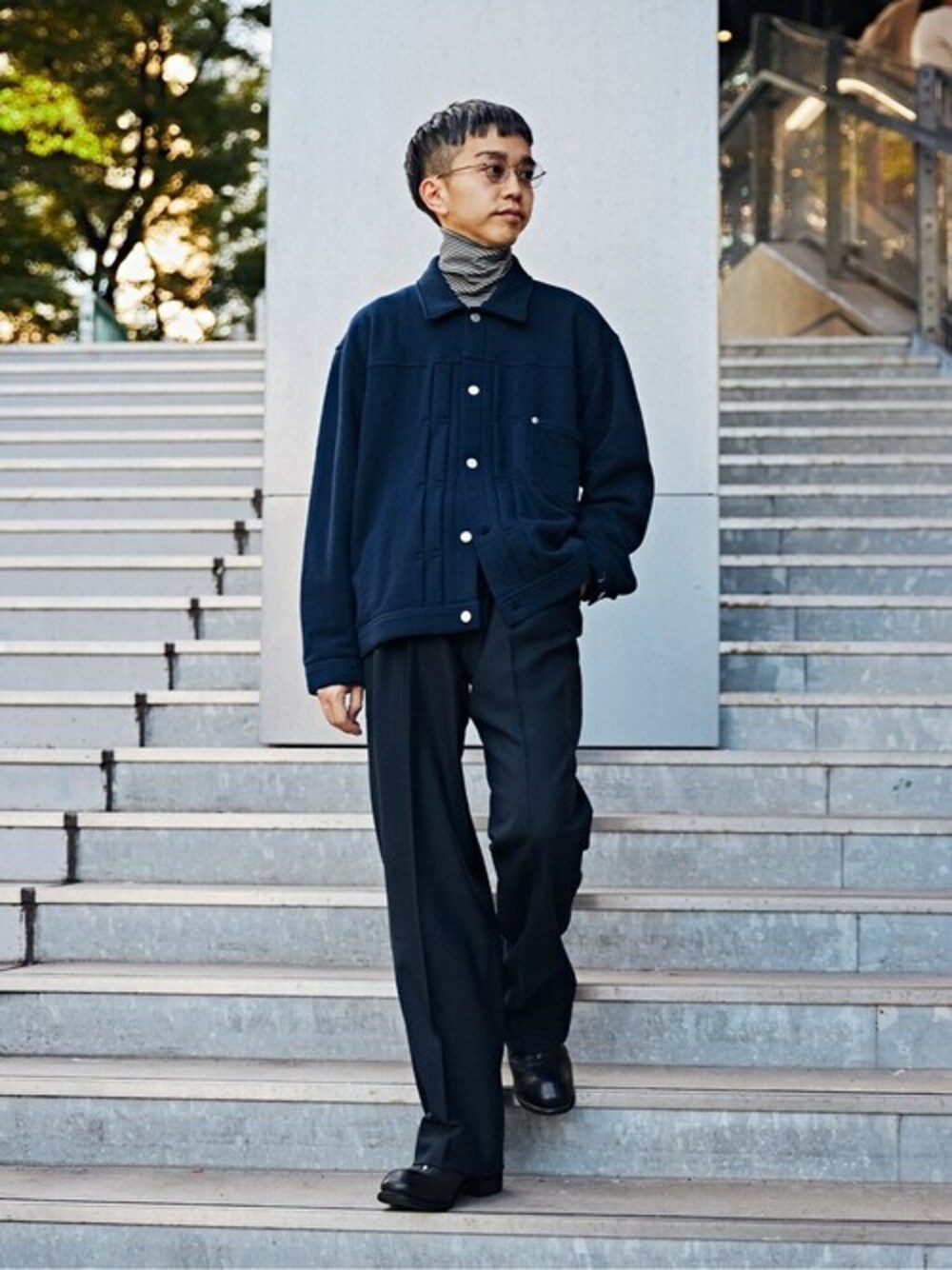 【LOOPWHEELER for LOWERCASE × POGGYTHEMAN】別注 スウェット トラッカージャケット 30代前半 / 身長:175センチ、痩せ型 / 普段サイズ:M/ 着用サイズ:M ネイビーのワントーンでシックな雰囲気にまとめました。 パンツには上品なスラックスを合わせたり、インナーにハイネックのカットソーを入れてスタイリングに品をプラスしてます。 ---------------------------------------------------------- サイズ感:全体的に程よくリラックス感のあるシルエットです。余裕があるので中に着込んでライトアウターとしても使えます。 素材感:柔らかな生地感です。 着心地:生地が軽くシルエットもゆとりがあるので着用のストレスは全くないです。生地が柔らかくゴワつきがないので、1枚ではもちろん、アウターのインナー使いにも活躍できます。 ----------------------------------------------------------