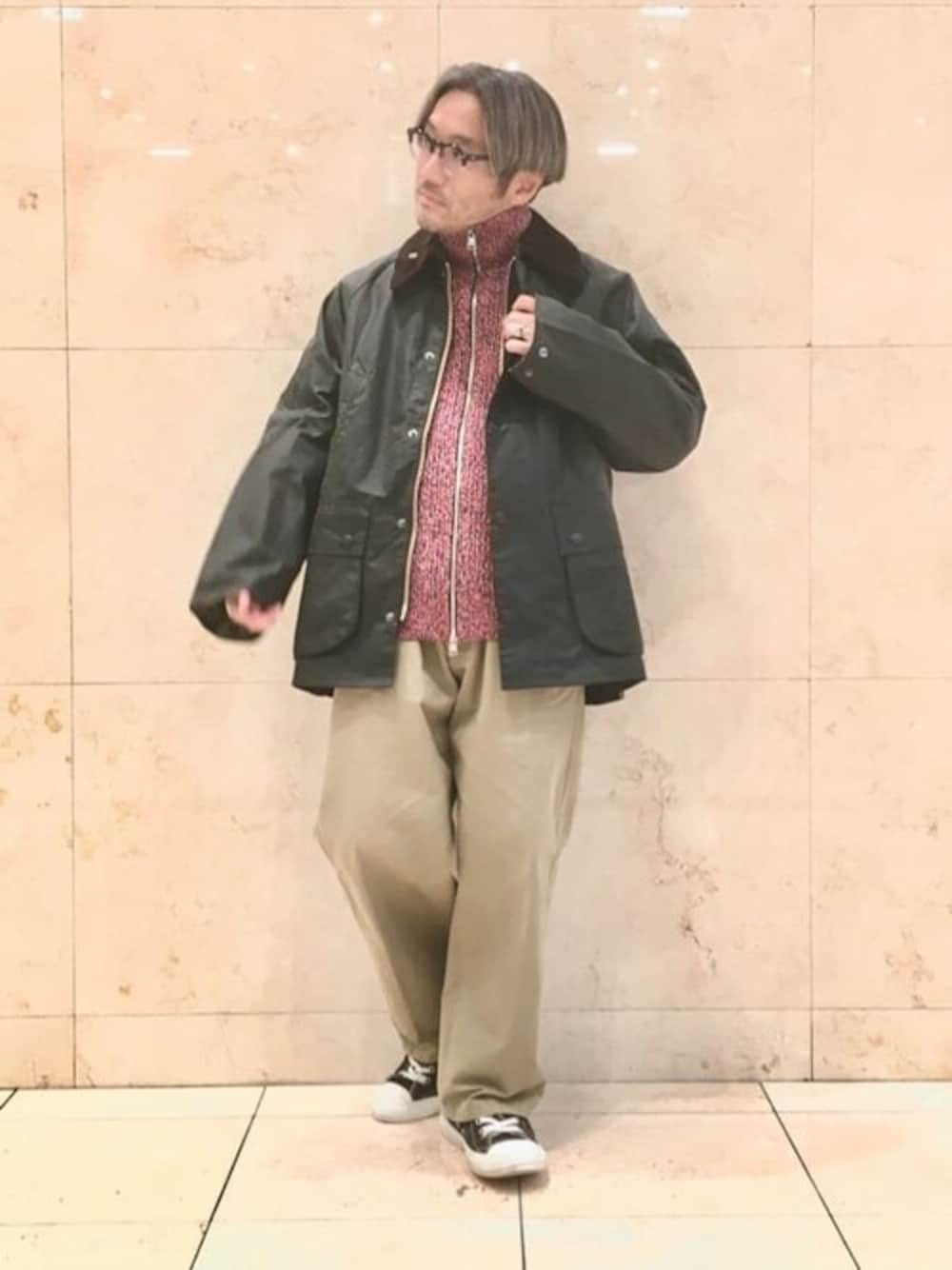 【Barbour OS WAX BEDALE】 オーバーサイズなのでざっくりしたジップニットをイン 40代 163センチ 普通体型 普段着用M 着用サイズ38 サイズ感 ゆったり 素材感 綿100 着心地 ワックスだが重さもなくゆったりしてるのでざっくりニットも楽にインできる