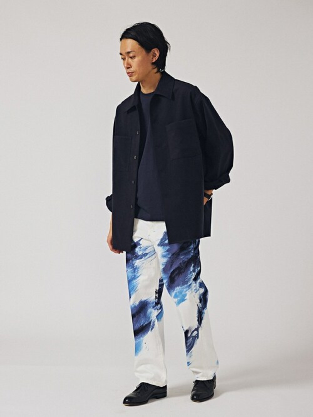 30代後半 / 身長:178cm / 体型:標準 / 普段サイズ:L レトロな雰囲気のデニムパンツを同系色のネイビーでまとめたスタイリングです。 ホワイト×ブルーのペイントが一足先の春の装いにピッタリです。 ■【LA BOUCLE / ラブークル】5ポケット デニム 着用サイズ:L ---------------------------------------------------------- サイズ感:ゆったりとしたサイズ感。ウエスト周りもやや余裕あります 素材感:しなやかなながら芯の感じるデニム素材 着心地:ゆったりとしているので快適です ----------------------------------------------------------