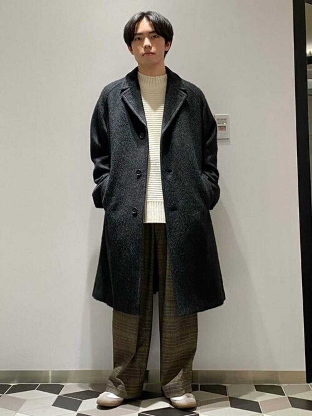 【ReWOOL(R)/リウール】シャギーオーバーコート 20代前半/身長:170センチ、痩せ型/普段サイズ:M/着用サイズ:M 【instagram】→ @_122k._ オーバーコートに太めのパンツ、ゆるさを出しながらもシャギーの素材感と色味で大人っぽく落ち着いたスタイルにしました。 シャギーの毛足立つ感じが主役になるようインナー、パンツはすっきりとした生地感のものを選びました。 ーーーーーーーーーーーーーーーーーーーーー一一 サイズ感:ゆとりのあるサイズ感になっておりジャケットなど少しボリュームのあるインナーも着込んでいただけます。 素材感:シャギーの起毛感、ふっくらとした生地感がネックを立てた際も心地よい肌触りを与えてくれます。 着心地:ラグジュアリーな雰囲気を持ちながらとても軽量になっているので冬場の着用ストレスを大幅に改善してくれます。 ーーーーーーーーーーーーーーーーーーーーー一一