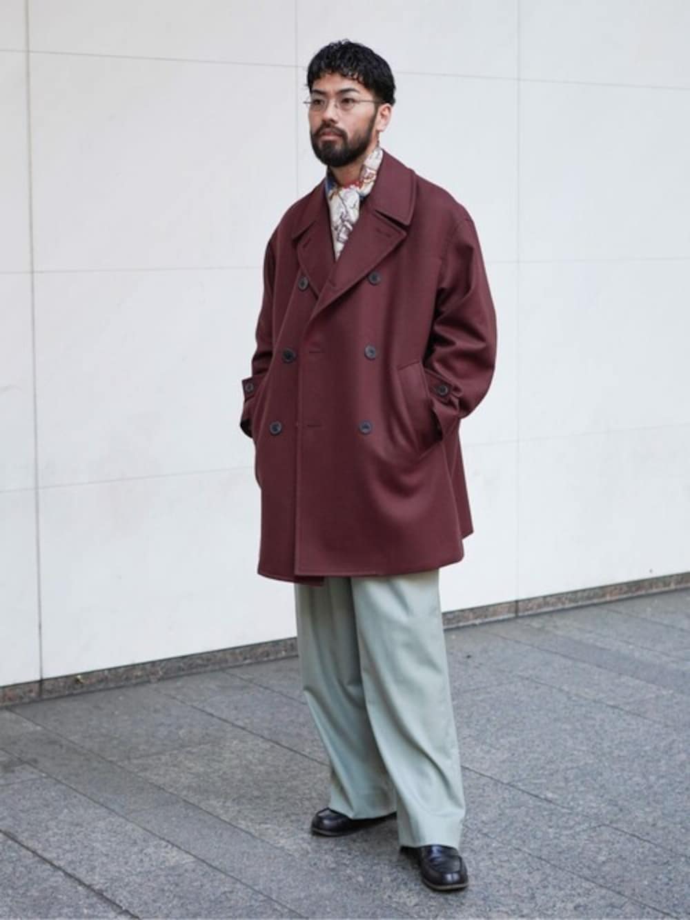 SUPER 100’s ファインメリノ オーバーピーコート instagram⇒y_uta.s 大人の雰囲気漂う上品なカラーのコートなので、他アイテムの組み合わせでもそれを崩さないよう意識。 オーバーサイズのシルエットに負けないよう、パンツもワイドな物を選びました。 --------------------------------- 30代前半 / 身長:176cm / 体型:痩せ型 / 普段サイズ:M or L 素材感:スーパー100'sのメルトンならではで、肌触りは滑らかで光沢感がある サイズ感:なんでも気込める程のオーバーサイズ 着心地:重さは感じず、スーパー100'sの滑らかさが相まって着やすい ---------------------------------