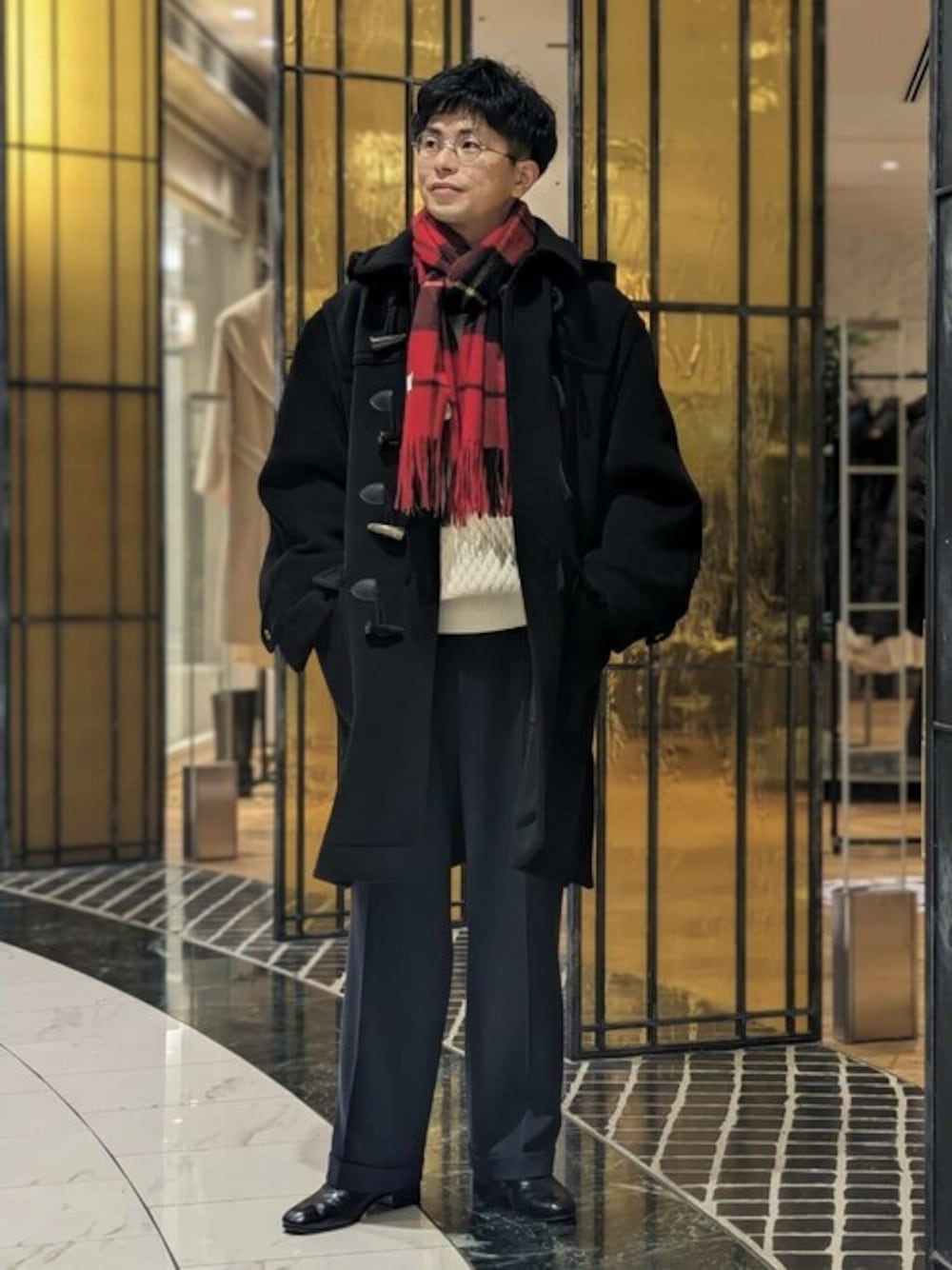インバーティア別注のダッフルコート オールブラックに仕上げることで、柔らかで可愛げのあるデザインにシックで大人な雰囲気がプラス。 通常よりゆとりのあるサイズ感でも、丈の長さがあるのでスタイリッシュな印象にも。 インナーに厚手のニットを着てもゴワつきにくいです。 ダークトーンの上下の落ち着いたカラーで合わせて大人っぽく、白のニットと差し色のマフラーで見た目も温かいコーディネートにしました。 Instagram→masurao.fashion 普段着用サイズ:M コート:38/ややゆったり ニット:L/ゆったり パンツ:46/ややゆったり