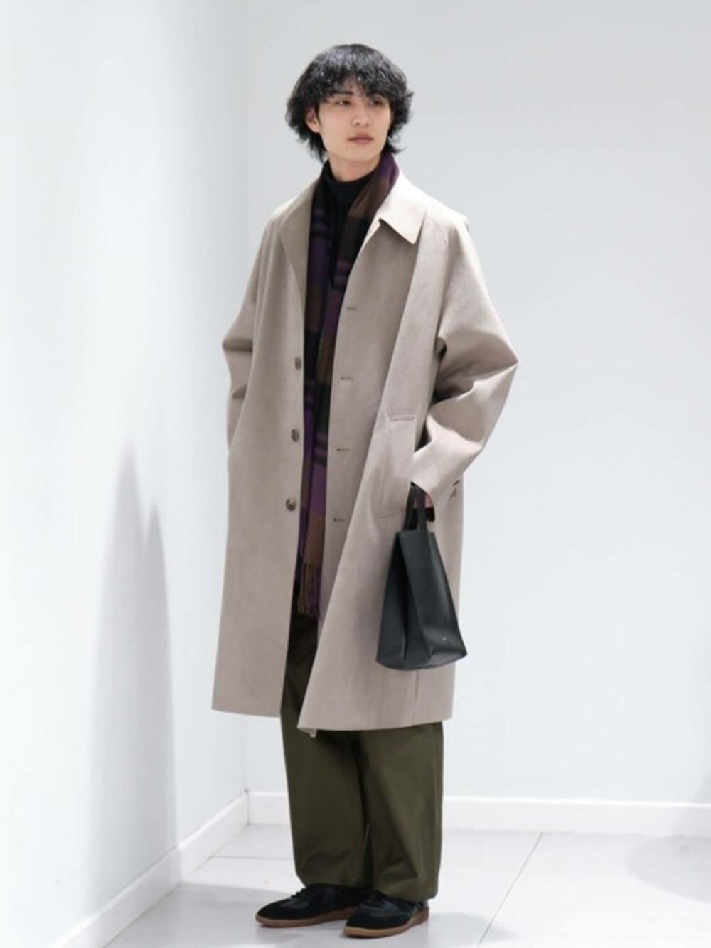 【LA BOUCLE】 ウルトラスエード コート Instagram ⇒ a.a.edy 雰囲気のあるコートに負けないよう、大判の柄のマフラーと、程良く太さのあるパンツをチョイス。 色だけでなく、素材の良さにも拘ったスタイリングです。 年齢:30代前半/身長:182センチ/体型:細身/普段サイズ:L/着用サイズ:3 サイズ感:大きめのサイズ感。インナーを選ばずガバっと羽織れるサイズ感です。 素材感:厚みのあるウルトラスウェード。スウェードのような素材感、ハリと耐久性があり、お手入れも楽な素材です。 着心地:ガバっと着やすく、羽織っただけで他では味わえない雰囲気が味わえます。 シワもできにくくお手入れも楽なので、見た目より気軽に着やすいのもポイントです。