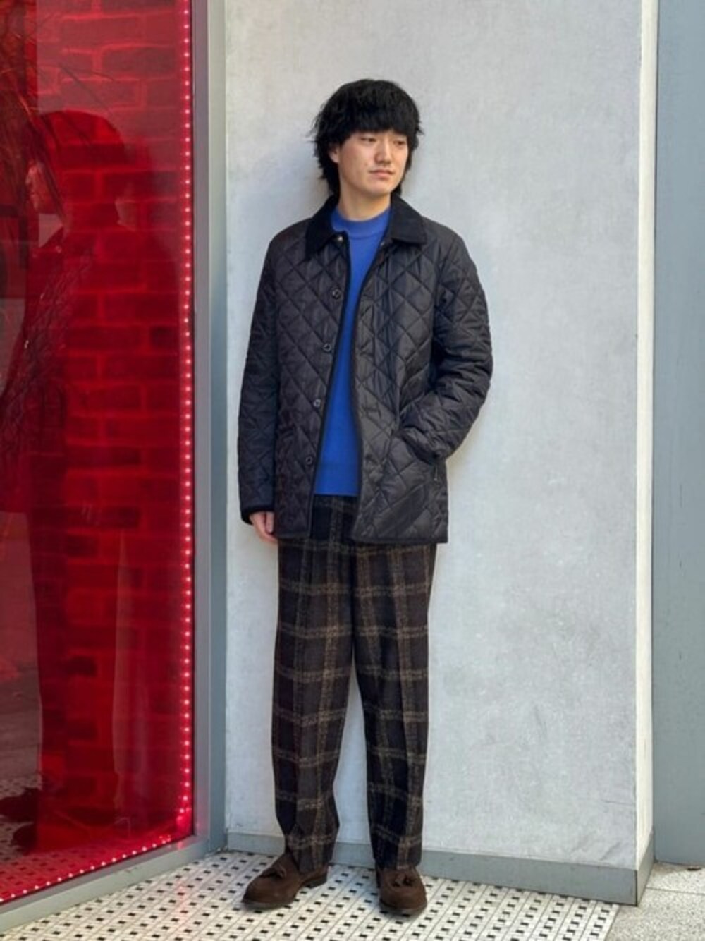 【MACKINTOSH / マッキントッシュ】別注 WAVERLY ナイロン 柄や色を使って大人カジュアルなテイストに。 上はブルー系、下はブラウン系と統一させることでまとまりが出ます。 insta→@kohey.bay 身長 : 181cm / 体型 : 細身 / 普段サイズ : Mor L / 着用サイズ : 40/ 年齢 : 20代 サイズ感 : 程よくゆとりのあるサイズ感。しっかりオーバーサイズではないためきれいに見えてインナーもある程度着込めます。 素材感:ナイロン素材ですが、ツヤが上品な佇まいを演出します。 着心地:見た目以上に軽く、スーツの上からでも気兼ねなく着れます。