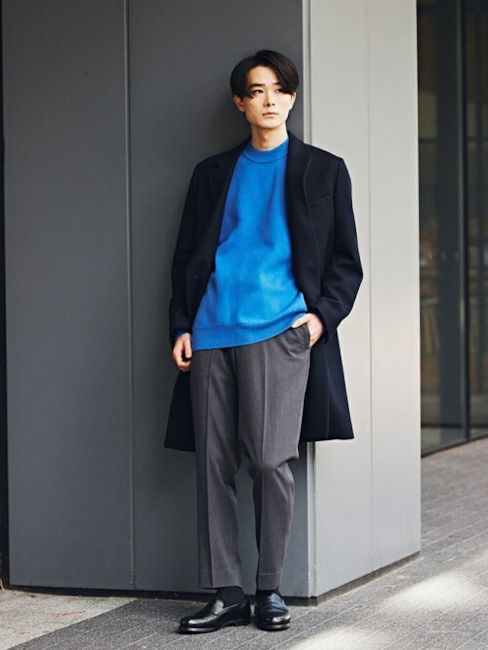 20代後半 / 身長:177cm / 体型:やせ型 / 普段サイズ:L チェスターコートにスラックスとEDIFICEらしいきれいめカジュアルなスタイリングです。 ブルーのニットをアクセントに全体的にすっきりとしたシルエットでまとめました。 イベントが多い年末年始にピッタリのスタイリングです。 ■SUPER 120’s ブレンド メルトン チェスターコート 着用サイズ:L ---------------------------------------------------------- サイズ感:身幅はややゆとりがあり、腕周りはスッキリとしています 素材感:適度にハリのあるウール素材 着心地:ごわつくこともなく、やや細身ながら着やすいです ---------------------------------------------------------- ■TR ストレッチ ウォーム ツイルイージースラックス 着用サイズ:L ---------------------------------------------------------- サイズ感:ヒップ周りから裾にかけてテーパードした綺麗なスリムフィット 素材感:滑らかで肌触りがよく、裏起毛なのであたたかい 着心地:着用した際のひんやり感がなく、且つソフトな風合い ----------------------------------------------------------