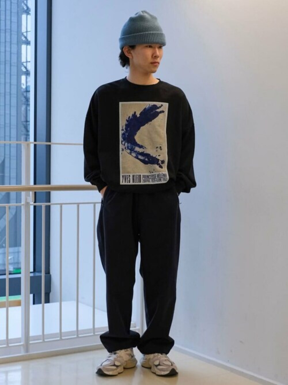 スポーティーなアイテムでまとめました。 素材感と色合わせで綺麗めな印象にコーディネートしました。 【YVES KLEIN / イヴ クライン】別注 グラフィック プリント スウェット 身長:169cm / 年齢:20 代/ 体型:標準/ 普段サイズ:M〜L サイズ: ややゆったり 素材感:肌触りの良いコットン素材 着心地:ゆとりがあって着やすい