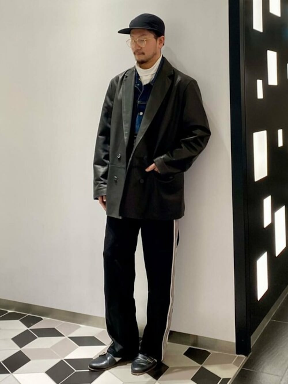 30代中盤 / 身長:170cm / 体型:標準体型 / 普段サイズ:M ハードになりがちなレザージャケットも、オーバーサイズならこなれた雰囲気に。黒ベースですが、パンツはトラックパンツで軽くしています。 ラムネイキッドレザー オーバージャケット 着用サイズ:M ---------------------------------------------------------- サイズ感:ゆとりあり。 素材感 :柔らかい羊革。レザーの割には軽めで着やすい。 ----------------------------------------------------------