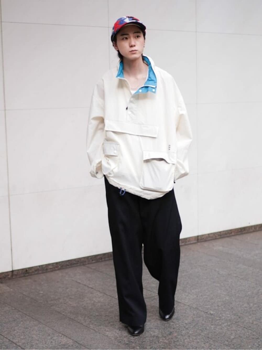 【ADULT ORIENTED ROBES】Sand Ski アノラック 20代前半/身長:174cm/体型:やせ型/普段サイズ:M~L/着用サイズ: L 【Instagram 】→ @___708n ①コーディネートポイント アノラック×スラックスでモダンなスポーティースタイルに。 肌見せでより春夏の季節感をイメージして。 ②サイズ感・着心地 かなりゆったりとした印象。 ナイロンの軽量さは春夏の暑さにもってこいな対応力。 着やすさも抜群です◎