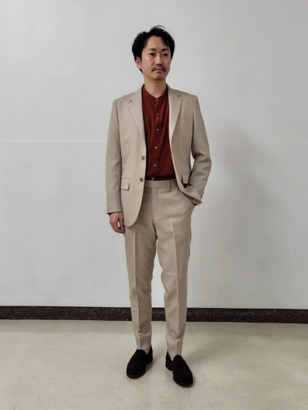 オクタ ワルツ ツイル 2B ジャケット【セットアップ着用可】のコーディネートスナップ ・コーディネートポイント →春らしくベージュカラーにインナーと靴を茶系にしモダンな雰囲気になる様コーディネートしました。 ・サイズ感 →細身で綺麗に見えるサイズ感。 ・着心地 →ウール見えする化学繊維ですが柔らかい着心地。 40代前半/身長:168㎝/体型:細身/普段サイズ:S/着用サイズ:S