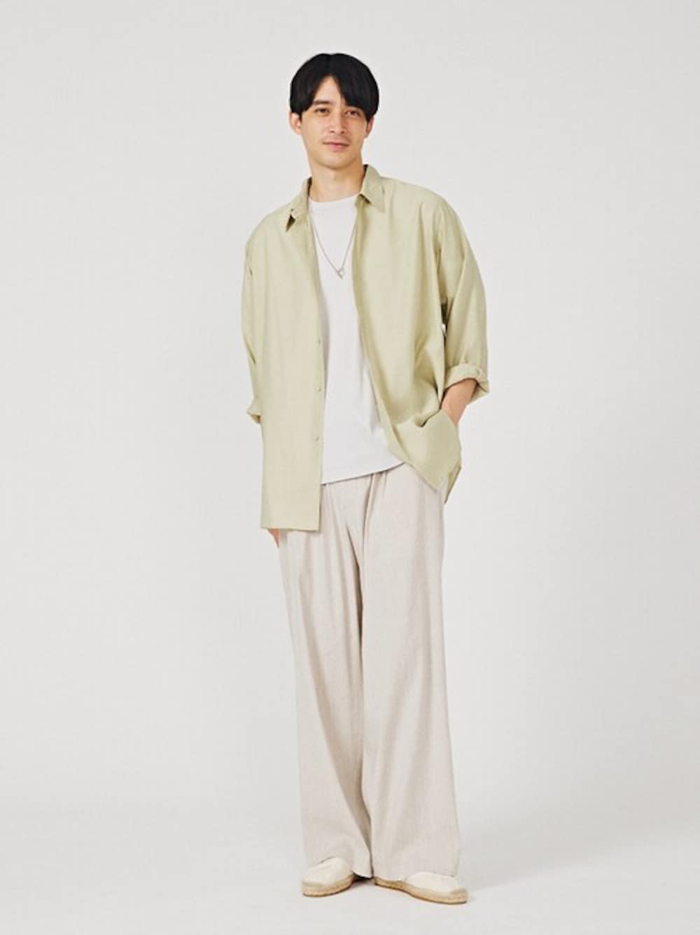 30代前半 / 身長:180cm / 体型:やせ型 / 普段サイズ:L フランスのヴィンテージのドレスシャツをベースに現代的なサイジング、パターンに落とし込んだレギュラーカラーシャツ。 シアーシャツを上品なリネン素材のパンツと合わせて春を先取りしたスタイリング。 アイテムの素材を活かし淡い色でまとめました。 ■エアークロス フレンチレギュラーカラー シアーシャツ 着用サイズ:L ---------------------------------------------------------- サイズ感:オーバーサイズまでいかない、ゆとりのあるサイズ感 素材感:適度なハリと静かな光沢感のある素材 着心地:ハリが動きを妨げないですし、非常に軽くて快適な着心地です ---------------------------------------------------------- ■リネン/ビスコース ストライプ ワイドイージーパンツ 着用サイズ:L ---------------------------------------------------------- サイズ感:全体的にゆったりとしたシルエット 素材感:自然な風合いのある素材感 着心地:素材感とシルエットが相まって履きやすく、快適です ----------------------------------------------------------