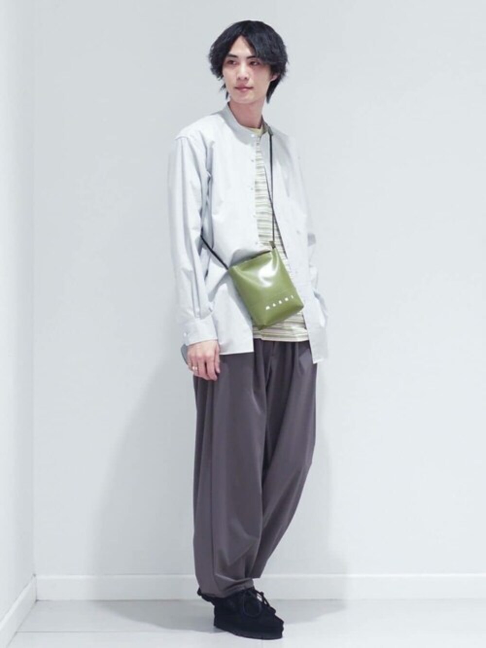 【LA BOUCLE】 120/2SUVIN タイプライター バンドカラーシャツ ---------------------------------------------------------- Instagram ⇒ a.a.edy ---------------------------------------------------------- 柄のトップスをインナーに、小物と色を合わせました。 それ以外のアイテムはシンプルな色を選び、インナーと小物が映えるように。 ---------------------------------------------------------- 年齢:30代前半 身長:182センチ 体型:細身 普段サイズ:L 着用サイズ:L ---------------------------------------------------------- サイズ感:ゆったりとしたサイズ感。身長182cm細身の自分が、Lサイズでバサッと羽織れるサイズ。 素材感:滑らかな手触りで、ハリがある素材。高級感もあります。 着心地:軽くてバサッと羽織りやすいです。バンドカラーはインナーでも羽織りとしても使いやすく、汎用性が高いです。
