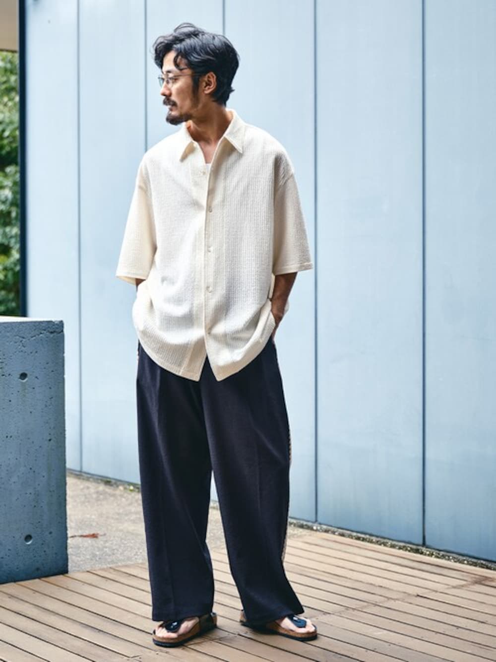 30代前半/身長:177cm/体型:やせ型/普段サイズ:L ワイドシルエットのイージーパンツ。 オーバーサイズのシャツにイージーパンツとリラックスした大人のスタイリング。 夏のご旅行にピッタリのスタイリングです。 ■ウェーブメッシュ ワイドシルエット オープンカラーシャツ 着用サイズ:L ---------------------------------------------------------- サイズ感:全体的に大き目なシルエット。袖の長さは5分袖に近いです 素材感:サラリとした質感の生地 着心地:ソフトな着心地とメッシュ調の生地が快適な着心地です ---------------------------------------------------------- ■シャンタン サイドライン ワイド イージーパンツ 着用サイズ:L ---------------------------------------------------------- サイズ感:ゆったりとしたサイズ感 素材感 :春夏らしいスラブ感のある素材感 着心地 :ウエストは紐で調節可能なのでリラックスして着用できます ----------------------------------------------------------