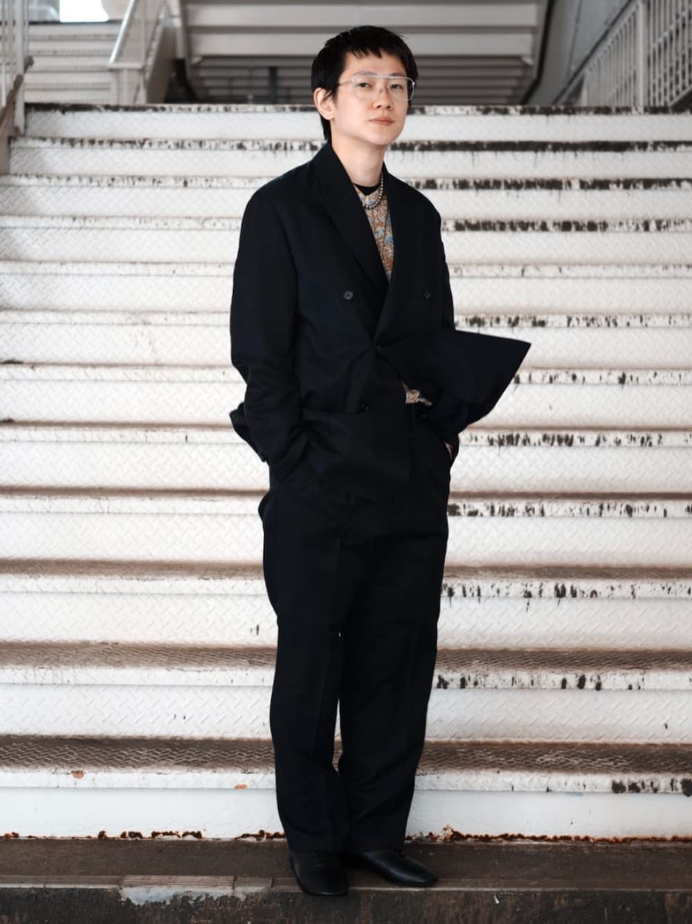 キュプラ/コットン/リネン ツイル ダブルブレストジャケット トレンド感ある総柄をセットアップの中に落とし込みドレス感を体現。 身長:173cm/ 普段サイズ:M/着用サイズ:M サイズ感:ややゆとりのあるスッキリとしたサイズ感 素材感:風合いの感じる素材 着心地:ドライな質感で、肌触りも良いので快適です