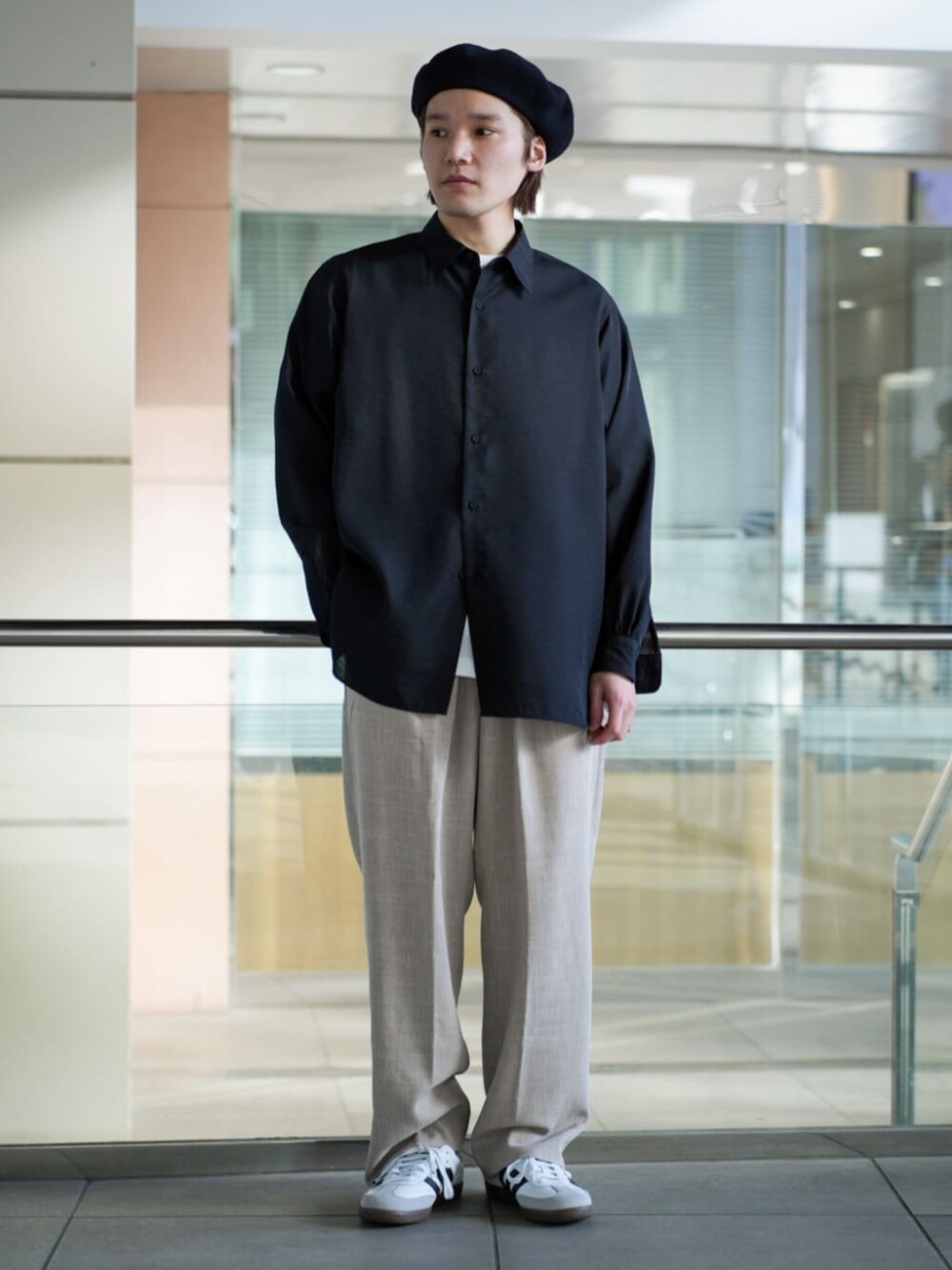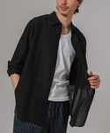エアークロス フレンチレギュラーカラー シアーシャツ アースカラーにブラックの色の掛け合わせでモダンな印象にコーディネート。 身長/169cm 体型/やせ型/普段サイズ/M 着用サイズ:M サイズ感:ゆったり 素材感:ツルッとしてやや光沢のある生地感。透け感は控えめ。