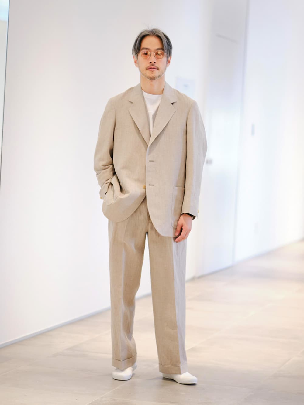 40代前半 / 身長:172cm / 体型:標準型 / 普段サイズ:M / 着用サイズ:M ベージュセットアップを中心にしたクリーンなスタイリング。素材の風合いを生かすために色数を絞って品よく纏めています。