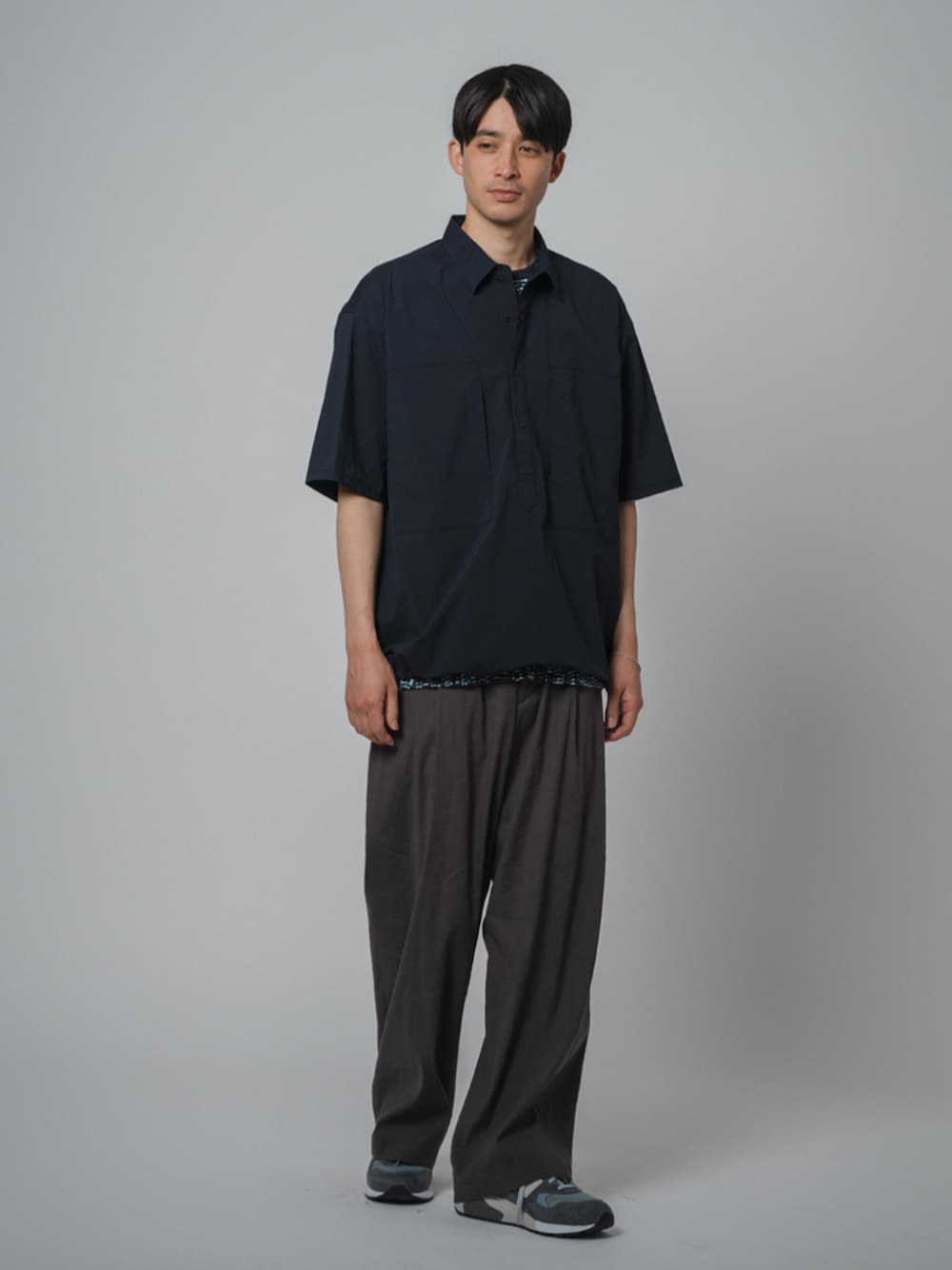 30代前半 / 身長:180cm / 体型:やせ型 / 普段サイズ:L US ARMYのプルオーバーシャツをデザインベースにしたシャツ。 イージー仕様のワイドパンツと合わせて大人の休日スタイルを意識しました。 ■ドライナイロン ダブルポケット 半袖アーミーシャツ 着用サイズ:L ---------------------------------------------------------- サイズ感:程良くワイドシルエットのサイズ感。 素材感 :細番手のナイロンを使用したライトなストレッチタフタ素材。 着心地 :ドライなタッチ感、肌離れの良さ、圧倒的な軽さが特徴です。 ---------------------------------------------------------- ■リネン/ビスコース ポプリン ワイドイージーパンツ 着用サイズ:L ---------------------------------------------------------- サイズ感:全体的にゆったりとしたシルエット 素材感:自然な風合いのある素材感 着心地:素材感とシルエットが相まって履きやすく、快適です ----------------------------------------------------------