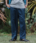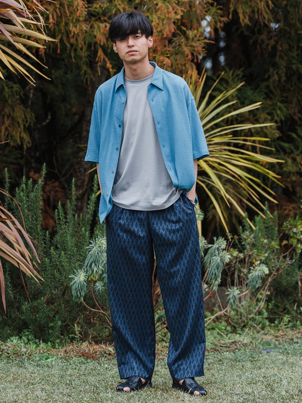 30代前半 / 身長:183cm / 体型:標準型 / 普段サイズ:L モダンな柄のパンツはシャツと合わせてリゾートっぽいスタイリングに。 ブルーのワントーンでも素材や色で濃淡をつけてメリハリを意識しました。 ■ウェーブメッシュ ワイドシルエット オープンカラーシャツ 着用サイズ:L ---------------------------------------------------------- サイズ感:全体的に大き目なシルエット。袖の長さは5分袖に近いです 素材感:サラリとした質感の生地 着心地:ソフトな着心地とメッシュ調の生地が快適な着心地です ---------------------------------------------------------- ■バティック パターン1タック イージーパンツ 着用サイズ:L ---------------------------------------------------------- サイズ感:下半身のラインを綺麗に見せてくれる、ストンと落ちるシルエット 素材感 :通気性もよく、生地表面に凹凸がある。 着心地 :ドライなタッチと肌ばなれがよい。 ----------------------------------------------------------