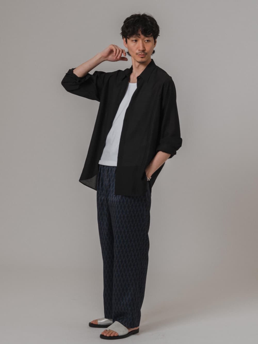 40代前半/身長:178センチ、痩せ型 / 普段サイズ:L フランスのヴィンテージのドレスシャツをベースに現代的なサイジング、パターンに落とし込んだレギュラーカラーシャツ。 透け感のあるブラックシャツなので重くならず涼しげな印象に。 イージーパンツと合わせてリラックスしたスタイリングにしました。 ■エアークロス フレンチレギュラーカラー シアーシャツ 着用サイズ:L ---------------------------------------------------------- サイズ感:オーバーサイズまでいかない、ゆとりのあるサイズ感 素材感:適度なハリと静かな光沢感のある素材 着心地:ハリが動きを妨げないですし、非常に軽くて快適な着心地です ---------------------------------------------------------- ■バティック パターン1タック イージーパンツ 着用サイズ:L ---------------------------------------------------------- サイズ感:下半身のラインを綺麗に見せてくれる、ストンと落ちるシルエット 素材感 :通気性もよく、生地表面に凹凸がある。 着心地 :ドライなタッチと肌ばなれがよい。 ----------------------------------------------------------