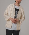 レーヨン/リネン パターン ノーカラーシャツ グアテマラシャツをベースにリネン/レーヨンのストライプ、チェック柄素材を使用したシャツ。 身長:183センチ/普段サイズ:XL/着用サイズ:L 体型:がっちり体型 サイズ感:Lサイズでジャストサイズ 素材感:ドライで風合いのある質感の素材 着心地:軽い着心地とドライな質感により快適です