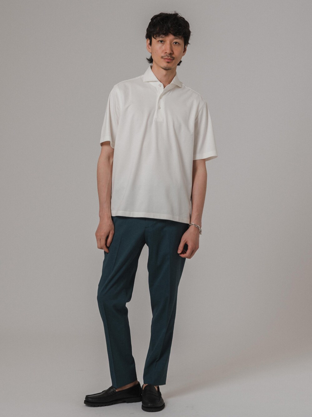 40代前半/身長:178センチ、痩せ型 / 普段サイズ:L カッタウェイカラーのショートスリーブポロシャツ。 カラーパンツと合わせてカジュアルダウンし、休日のお出かけにピッタリなスタイリングにしました。 ■”ストレッチ&防シワ機能”SOLOTEX カルゼポロシャツ 着用サイズ:L ---------------------------------------------------------- サイズ感:適度なゆとりがある 素材感 :カルゼ組織のハイゲージジャージ素材 着心地 :ストレッチ性があり、型崩れしにくい ---------------------------------------------------------- ■"抗菌防臭&シワ防止機能" ワルツ ツイル テーパードパンツ 着用サイズ:L ---------------------------------------------------------- サイズ感:タイト過ぎないほどよいフィット感 素材感:シャリ感があり肌当たりの良い素材 着心地:ドライタッチで伸縮性にも富んでいる為軽快な着心地 ----------------------------------------------------------