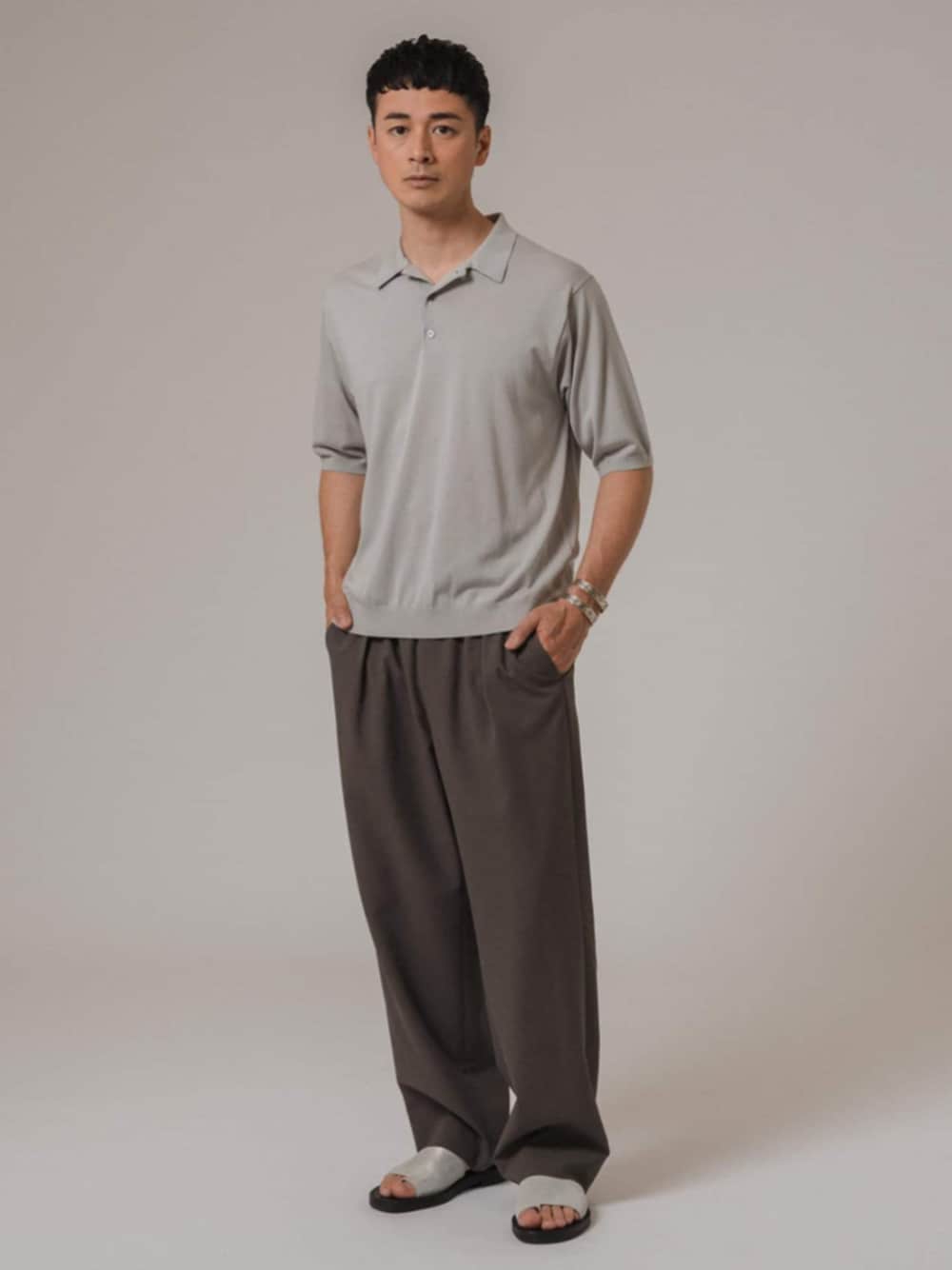 30代後半/身長:176センチ、標準型 / 普段サイズ:L ほどよい大きさのシルエットが大人感を演出するニットポロシャツ。 グレーのワントーンで纏めましたが、ボトムは濃い目のグレーでぼんやりせずメリハリのあるスタイリングしました。 ■シルクミックス ニットポロシャツ 着用サイズ:L ---------------------------------------------------------- サイズ感:ほどよい大きさのシルエット 素材感 :シルクミックスですが手洗い可能でイージーケア 着心地 :滑らかで着心地抜群 ---------------------------------------------------------- ■SAP ドットエアー ストレッチ 1タックイージーパンツ 着用サイズ:L ---------------------------------------------------------- サイズ感:ワイドシルエットでウエストはゴム仕様 素材感 :通気口のある機能ポリエステル素材 着心地 :ドライで清涼感ある肌触り ----------------------------------------------------------