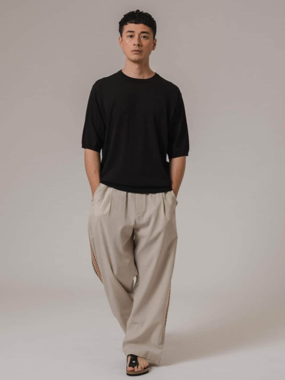 30代後半/身長:176センチ、標準型 / 普段サイズ:L ほどよい大きさのシルエットが大人感を演出するニットTシャツ。 シンプルで使い勝手が良く、オンオフで使える万能アイテム。 カジュアルなパンツと合わせても、どこか品の良さが感じられて大人っぽい印象に。 ■シルクミックス ニットTシャツ 着用サイズ:L ---------------------------------------------------------- サイズ感:ほどよい大きさのシルエット 素材感 :シルクミックスですが手洗い可能でイージーケア 着心地 :滑らかで着心地抜群 ---------------------------------------------------------- ■シャンタン サイドライン ワイド イージーパンツ 着用サイズ:L ---------------------------------------------------------- サイズ感:ゆったりとしたサイズ感 素材感 :春夏らしいスラブ感のある素材感 着心地 :ウエストは紐で調節可能なのでリラックスして着用できます ----------------------------------------------------------