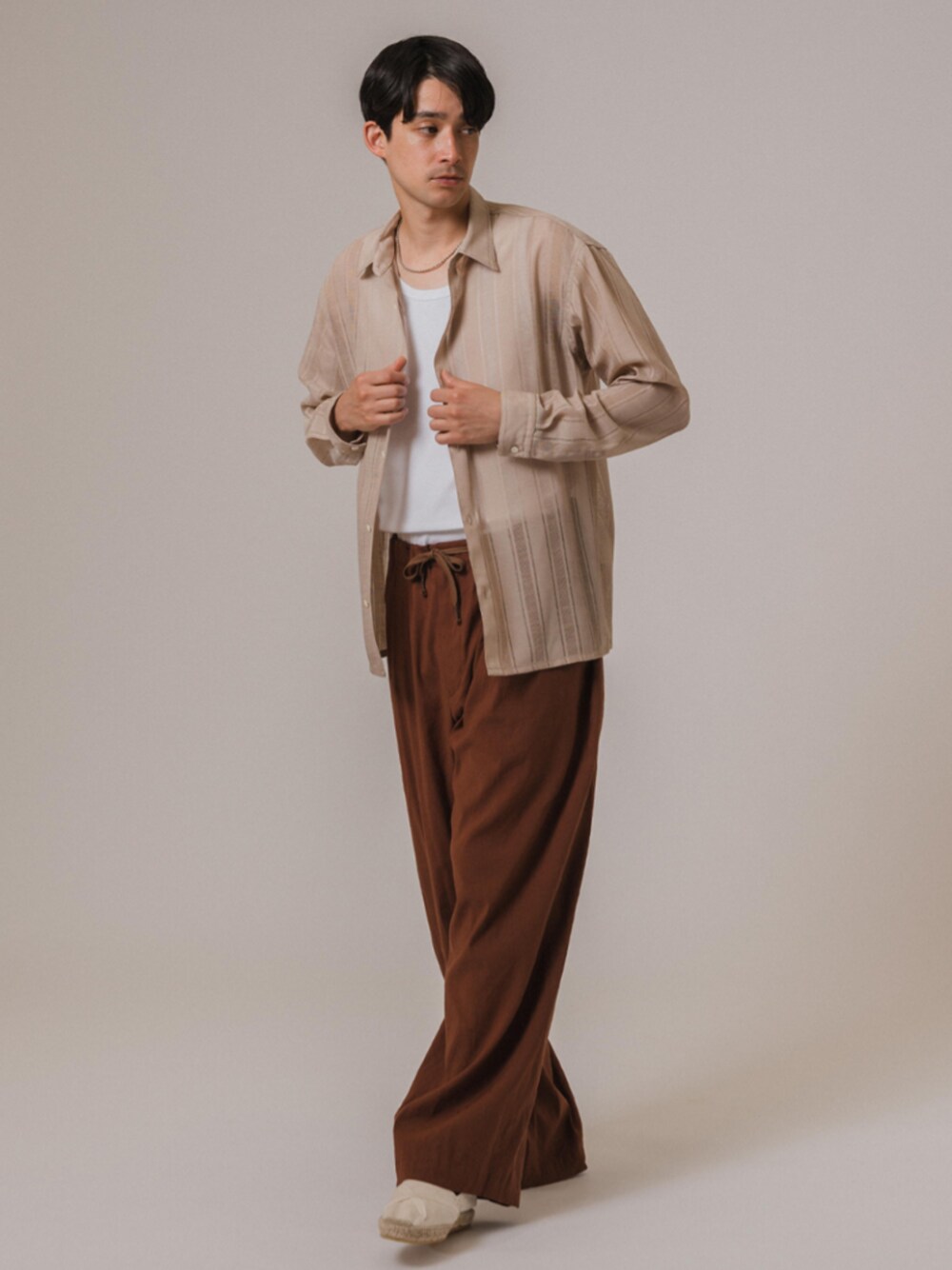 30代前半 / 身長:180cm / 体型:やせ型 / 普段サイズ:L 適度な透け感と落ち感で高級感のある雰囲気のシャツ。 室内の冷房対策や朝晩の肌寒い時には羽織としてもおすすめです。 ■Leno cloth レギュラーカラーシャツ 着用サイズ:L ---------------------------------------------------------- サイズ感:軽く羽織れるサイズ感 素材感 :スラブ糸を使ったナチュラルな風合い 着心地 :シアー感のある見た目にも軽やかな生地感 ---------------------------------------------------------- ■リネン/ビスコース ポプリン ワイドイージーパンツ 着用サイズ:L ---------------------------------------------------------- サイズ感:全体的にゆったりとしたシルエット 素材感:自然な風合いのある素材感 着心地:素材感とシルエットが相まって履きやすく、快適です ----------------------------------------------------------