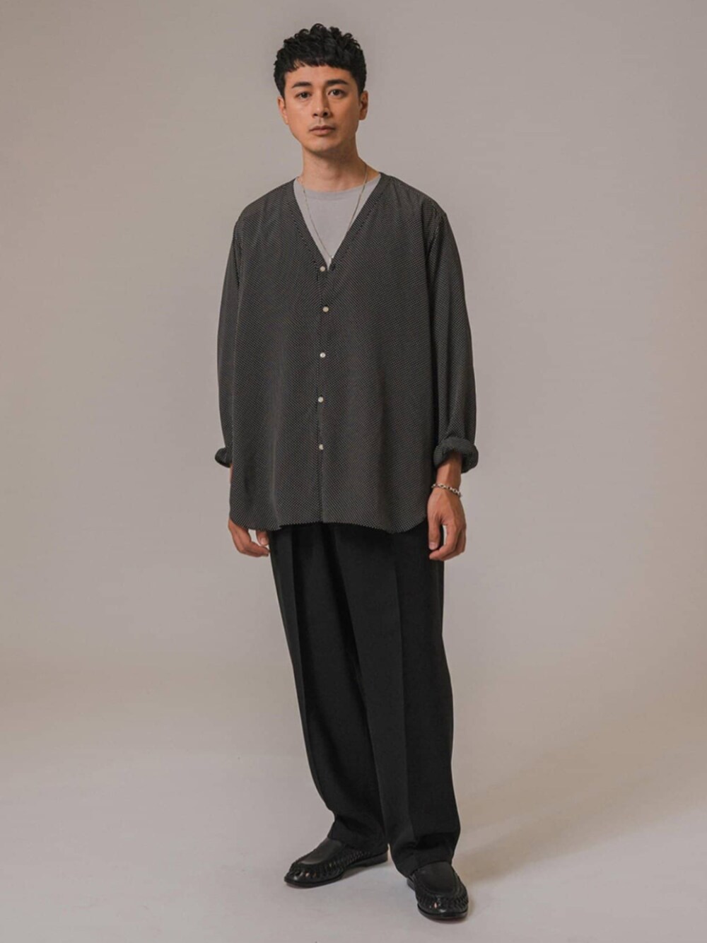 30代後半/身長:176センチ、標準型 / 普段サイズ:L Vカーディガンのような衿のないすっきりとした首まわりが特徴的なデザインのVネックシャツ。 シルエットは、極端に肩は落とさず袖を長めにとることで、子供っぽく見せずに肩の力が抜けたムードを表現できる秀逸なリラックスフィット。 ■パターンデシン Vネックシャツ 着用サイズ:L ---------------------------------------------------------- サイズ感:適度にゆったりとしたサイズ感 素材感:とろみ感のあるしなやかな素材 着心地:肌触りも良くサイズ感と相まって快適です ---------------------------------------------------------- ■”撥水&汗染み防止機能” プロテック ポンチ Tシャツ 着用サイズ:L ---------------------------------------------------------- サイズ感:ややゆとりのあるリラックスフィット 素材感:程よいハリとしなやかさのあるコットン素材 着心地:サラッとした肌触りなので快適です ----------------------------------------------------------