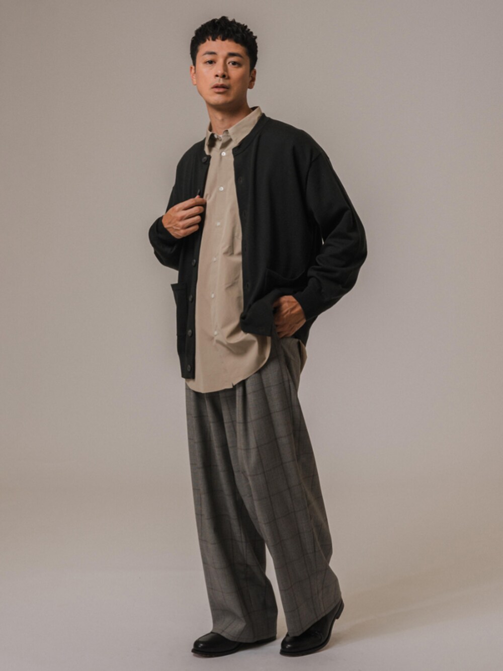 30代後半/身長:176センチ、標準型 / 普段サイズ:L アンチピリング加工をかけた14ゲージのクルーネックカーデ。 秋冬らしい深みのあるグリーンが、上品な大人の男性にピッタリ。 柄のパンツとも合わせやすく、モノトーンばかり着用する方にもおすすめ。 ■LA BOUCLE(ラブークル) アンチピリング カーディガン 着用サイズ:3 ---------------------------------------------------------- サイズ感:ジャストルーズなサイズ感 素材感:上質でしっとりとした生地感 着心地:リラックス感のあるシルエットなので着やすく、重さもあまり感じません ---------------------------------------------------------- ■THOMAS MASON(トーマスメイソン) オーバーサイズ レギュラーカラーシャツ 着用サイズ:L ---------------------------------------------------------- サイズ感:ストレスフリーなゆったりとしたサイズ感 素材感:高級感が伝わるツヤと滑らかさを兼ね備えた素材 着心地:肌当たりの良いサラッとした質感とビッグシルエットが心地いい着心地 ---------------------------------------------------------- ■LA BOUCLE(ラブークル) Loro Piana Fabric ワイドパンツ 着用サイズ:L ---------------------------------------------------------- サイズ感:たっぷりとしたワイドシルエット 素材感:上質でしっとりとしたウール生地 着心地:ウエスト周りは余裕がありますが、履きやすいシルエットです ----------------------------------------------------------