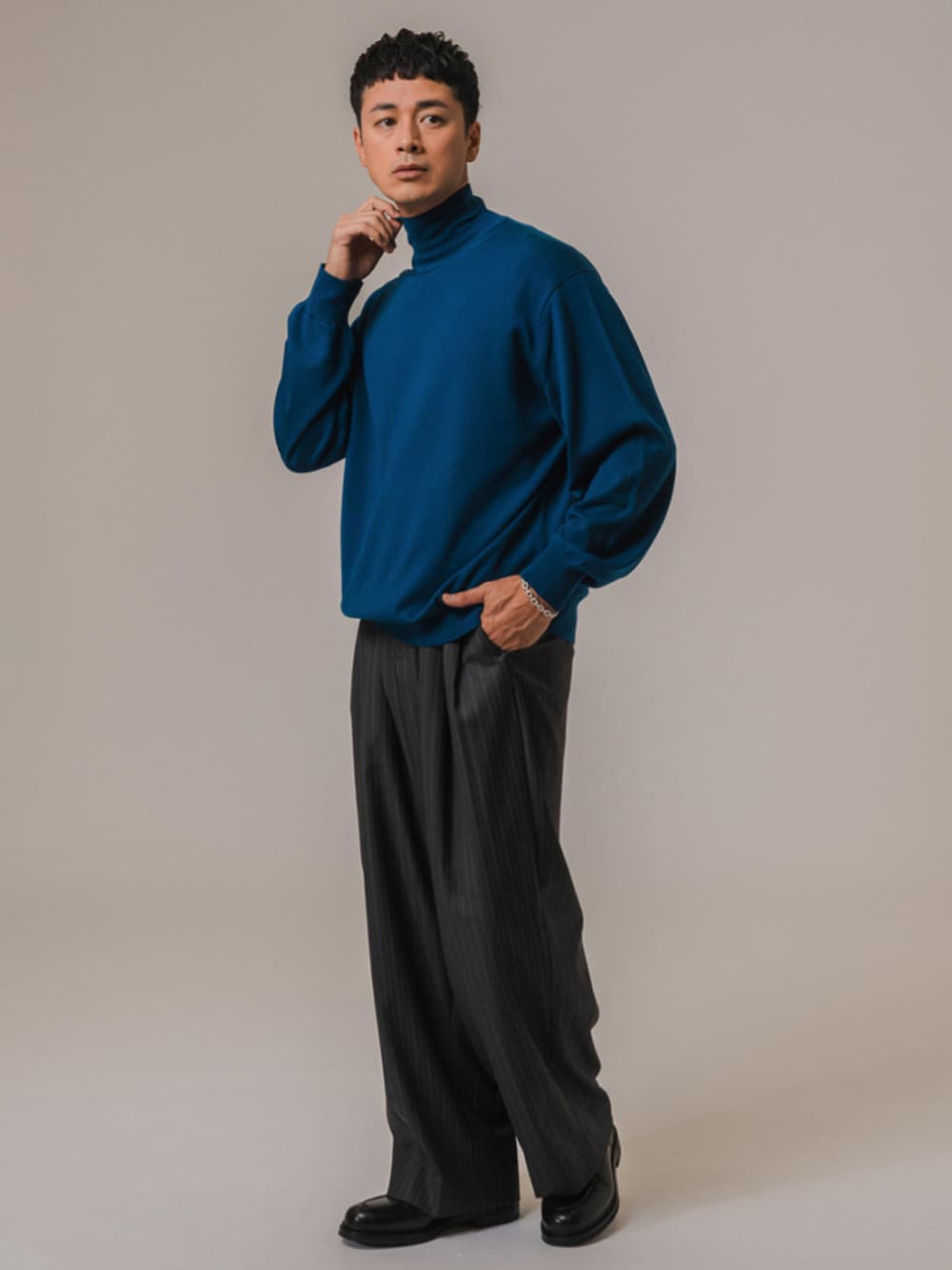 30代後半/身長:176センチ、標準型 / 普段サイズ:L アンチピリング加工をかけたハイネックニット。 シルクのような光沢と発色の良さもおすすめポイント。 チープに見えてしまうカラーニットも、高見えすること間違いなし。 ■LA BOUCLE(ラブークル) アンチピリング ハイネックニット 着用サイズ:L ---------------------------------------------------------- サイズ感:ジャストルーズなサイズ感 素材感:上質でしっとりとした生地感 着心地:リラックス感のあるシルエットなので着やすく、重さもあまり感じません ---------------------------------------------------------- ■LA BOUCLE(ラブークル) Loro Piana Fabric ワイドパンツ 着用サイズ:L ---------------------------------------------------------- サイズ感:たっぷりとしたワイドシルエット 素材感:上質でしっとりとしたウール生地 着心地:ウエスト周りは余裕がありますが、履きやすいシルエットです ----------------------------------------------------------