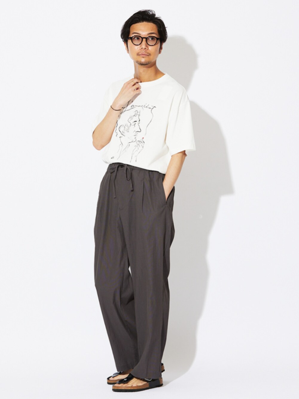 30代 / 身長:178cm / 体型:やせ型 / 普段サイズ:M or L ソリマチアキラ氏による作品をプリントしたEDIFICEオリジナルTシャツ。 ワイドシルエットのパンツと合わせて、大人のリラックスムード漂うカジュアルスタイルにしました。 ■ソリマチアキラ 別注 フレンチ イラストレーション Tシャツ 着用サイズ:L ---------------------------------------------------------- サイズ感:ややゆとりのあるリラックスフィット 素材感:風合いがあり、しっかりとしたコットン素材 着心地:ゆったりとしたシルエットなので着やすいです ---------------------------------------------------------- ■ストライプ クレープ 1プリーツ イージーパンツ 着用サイズ:L ---------------------------------------------------------- サイズ感:ワイドシルエットでゆったりしています 素材感 :コットン/ナイロンベースの凹凸のある立体的な素材感 着心地 :軽くて、肌への接地面も少ない為、快適です ----------------------------------------------------------