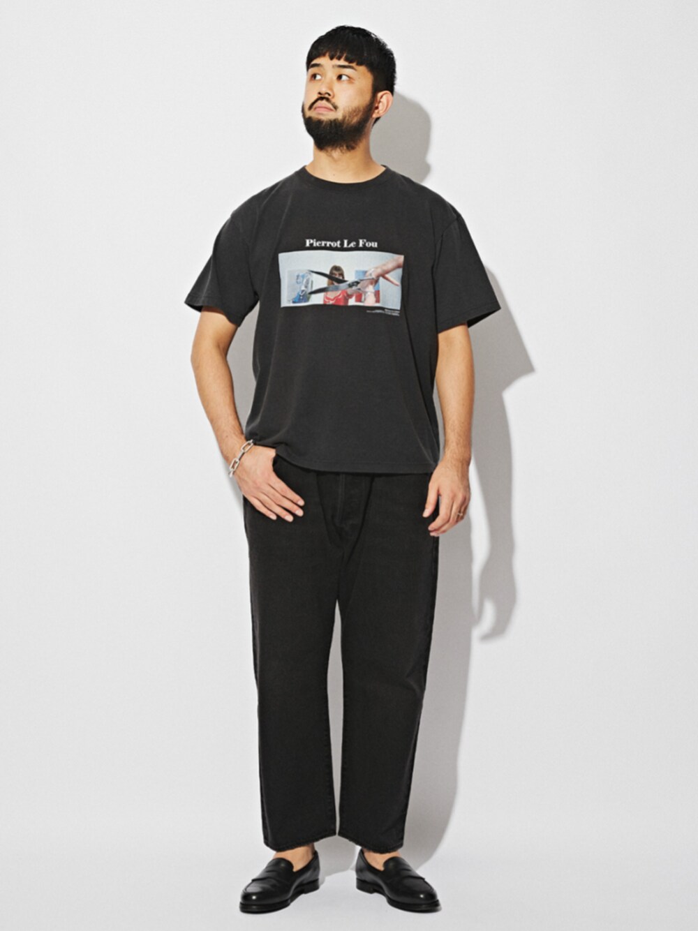 30代前半 / 身長:183cm / 体型:ガッチリ / 普段サイズ:XL 誕生から150周年を過ぎたLevi's 501(R)のEDIFIC30周年記念モデル。 大人気アイテムから質実なブラックカラーが登場です。 ウエストは44インチでも、レングス26インチを採用しているので、オーバーサイズでもジャストなレングスとなる絶妙なシルエットが特徴です。 足元はスニーカーを合わせても良いですが、ロファーでキレイめに着こなしてみました。 ■Jean-Luc Godard ウォッシュ加工 プリントTシャツ 着用サイズ:L ---------------------------------------------------------- サイズ感:ジャストルーズでややゆとりのあるサイズ感 素材感:ソフトな質感のコットン生地 着心地:リラックス感があるので着やすく快適です ---------------------------------------------------------- ■Levi’s(リーバイス) 30th 別注 BIG E 501(R) BLACK L26 着用サイズ:44 ---------------------------------------------------------- サイズ感:裾に向かってすっきりとしたストレートシルエット 素材感 :リアルなVINTAGE加工 着心地 :程よくジャストフィット ----------------------------------------------------------