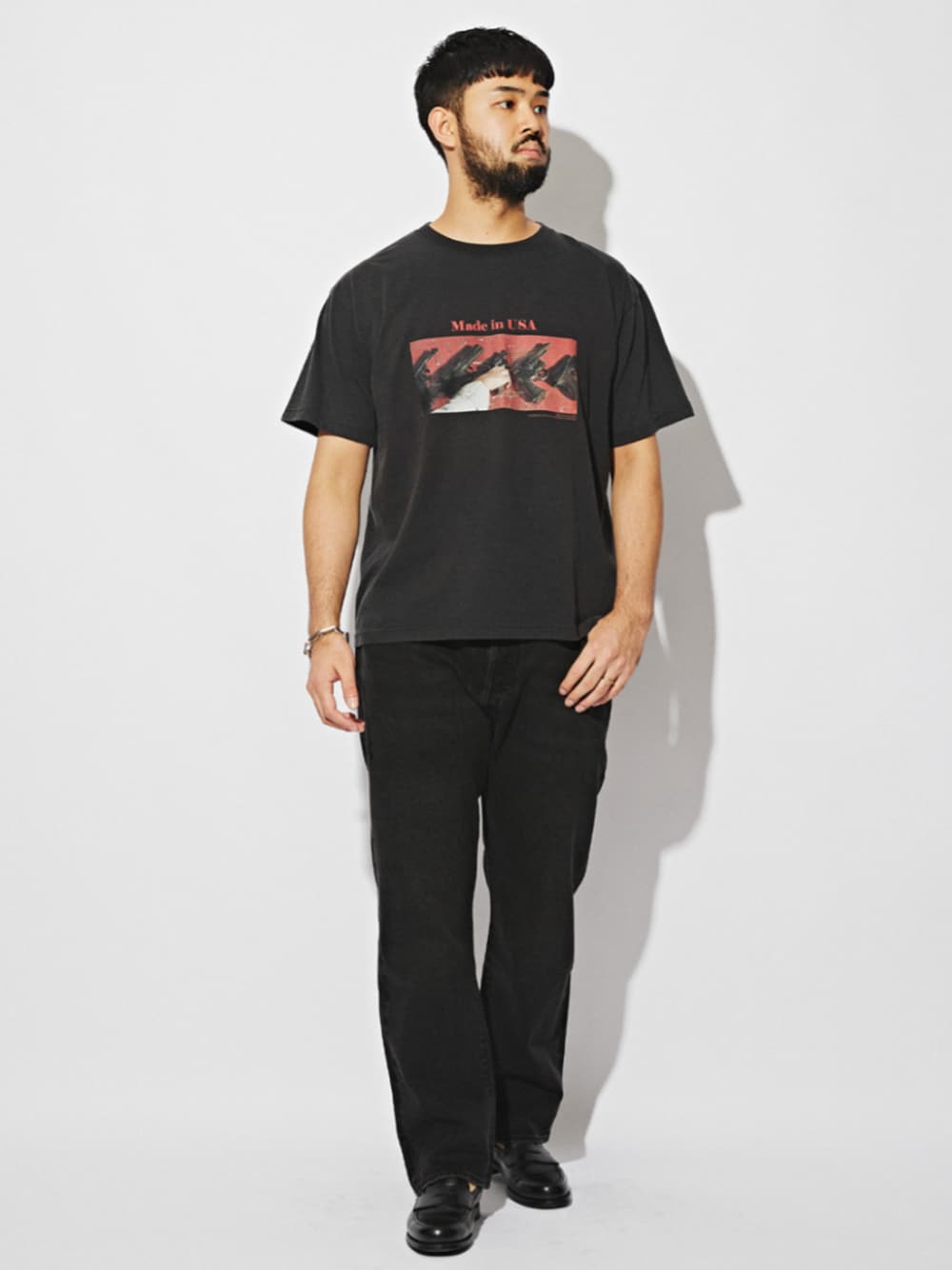 30代前半 / 身長:183cm / 体型:ガッチリ / 普段サイズ:XL 誕生から150周年を過ぎたLevi's 501(R)のEDIFIC30周年記念モデル。 大人気アイテムから質実なブラックカラーが登場です。 ストレートシルエットなので、カジュアルからきれいめまで様々な着こなしが可能。 ブラックカラーが全体を引き締めて、スタイリッシュな印象にしてくれます。 ■Jean-Luc Godard ウォッシュ加工 プリントTシャツ 着用サイズ:L ---------------------------------------------------------- サイズ感:ジャストルーズでややゆとりのあるサイズ感 素材感:ソフトな質感のコットン生地 着心地:リラックス感があるので着やすく快適です ---------------------------------------------------------- ■Levi’s(リーバイス) 30th 別注 BIG E 501(R) BLACK L30 着用サイズ:38 ---------------------------------------------------------- サイズ感:裾に向かってすっきりとしたストレートシルエット 素材感 :リアルなVINTAGE加工 着心地 :程よくジャストフィット ----------------------------------------------------------