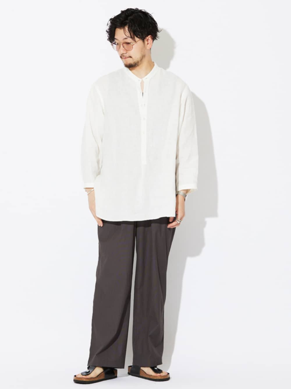 30代中盤 / 身長:170cm / 体型:標準 / 普段サイズ:M 深く開いた前立てが特徴のプルオーバータイプのバンドカラーシャツ。 リラックス感と落ち着いた品のあるバランスが特徴で、リネン素材の清涼感とナチュラルなシワ感が夏の装いにぴったりです。 ワイドシルエットのパンツとサンダルで合わせて、リラックスした着こなしにしました。 ■リネン 8分袖 バンドカラープルオーバーシャツ 着用サイズ:L ---------------------------------------------------------- サイズ感:全体的に程よくゆとりがある 素材感 :リネン100%の清涼感のある生地。 着心地 :リネン素材特有の通気性や肌離れが良い ---------------------------------------------------------- ■ストライプ クレープ 1プリーツ イージーパンツ 着用サイズ:L ---------------------------------------------------------- サイズ感:ワイドシルエットでゆったりしています 素材感 :コットン/ナイロンベースの凹凸のある立体的な素材感 着心地 :軽くて、肌への接地面も少ない為、快適です ----------------------------------------------------------
